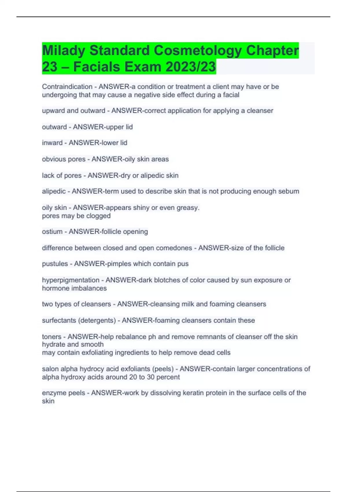 Contraindication - ANSWER-a condition or treatment a client may have or be undergoing that may cause a negative side effect during a facial upward and outward - ANSWER-correct application for applying a cleanser outward - ANSWER-upper lid inward - ANSWER-lower lid obvious pores - ANSWER-oily skin areas lack of pores - ANSWER-dry or alipedic skin alipedic - ANSWER-term used to describe skin that is not producing enough sebum oily skin - ANSWER-appears shiny or even greasy. pores may be clogged ostium - ANSWER-follicle opening difference between closed and open comedones - ANSWER-size of the follicle pustules - ANSWER-pimples which contain pus hyperpigmentation - ANSWER-dark blotches of color caused by sun exposure or hormone imbalances two types of cleansers - ANSWER-cleansing milk and foaming cleansers surfectants (detergents) - ANSWER-foaming cleansers contain these toners - ANSWER-help rebalance ph and remove remnants of cleanser off the skin hydrate and smooth may contain exfoliating ingredients to help remove dead cells salon alpha hydrocy acid exfoliants (peels) - ANSWER-contain larger concentrations of alpha hydroxy acids around 20 to 30 percent enzyme peels - ANSWER-work by dissolving keratin protein in the surface cells of the skin