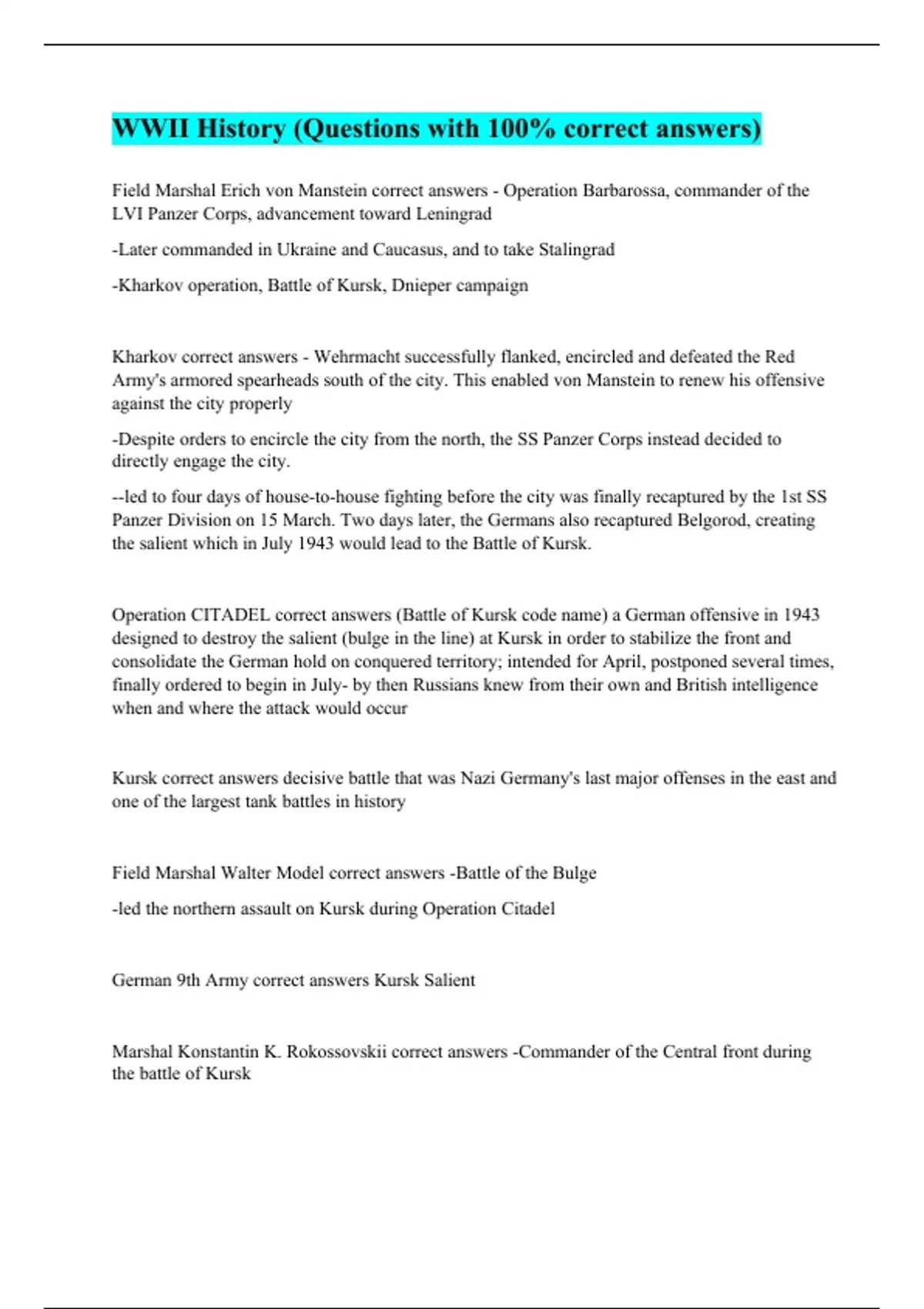 Field Marshal Erich von Manstein correct answers - Operation Barbarossa, commander of the LVI Panzer Corps, advancement toward Leningrad -Later commanded in Ukraine and Caucasus, and to take Stalingrad -Kharkov operation, Battle of Kursk, Dnieper campaign Kharkov correct answers - Wehrmacht successfully flanked, encircled and defeated the Red Army's armored spearheads south of the city. This enabled von Manstein to renew his offensive against the city properly -Despite orders to encircle the city from the north, the SS Panzer Corps instead decided to directly engage the city. --led to four days of house-to-house fighting before the city was finally recaptured by the 1st SS Panzer Division on 15 March. Two days later, the Germans also recaptured Belgorod, creating the salient which in July 1943 would lead to the Battle of Kursk. Operation CITADEL correct answers (Battle of Kursk code name) a German offensive in 1943 designed to destroy the salient (bulge in the line) at Kursk in order to stabilize the front and consolidate the German hold on conquered territory; intended for April, postponed several times, finally ordered to begin in July- by then Russians knew from their own and British intelligence when and where the attack would occur Kursk correct answers decisive battle that was Nazi Germany's last major offenses in the east and one of the largest tank battles in history Field Marshal Walter Model correct answers -Battle of the Bulge -led the northern assault on Kursk during Operation Citadel German 9th Army correct answers Kursk Salient Marshal Konstantin K. Rokossovskii correct answers -Commander of the Central front during the battle of Kursk