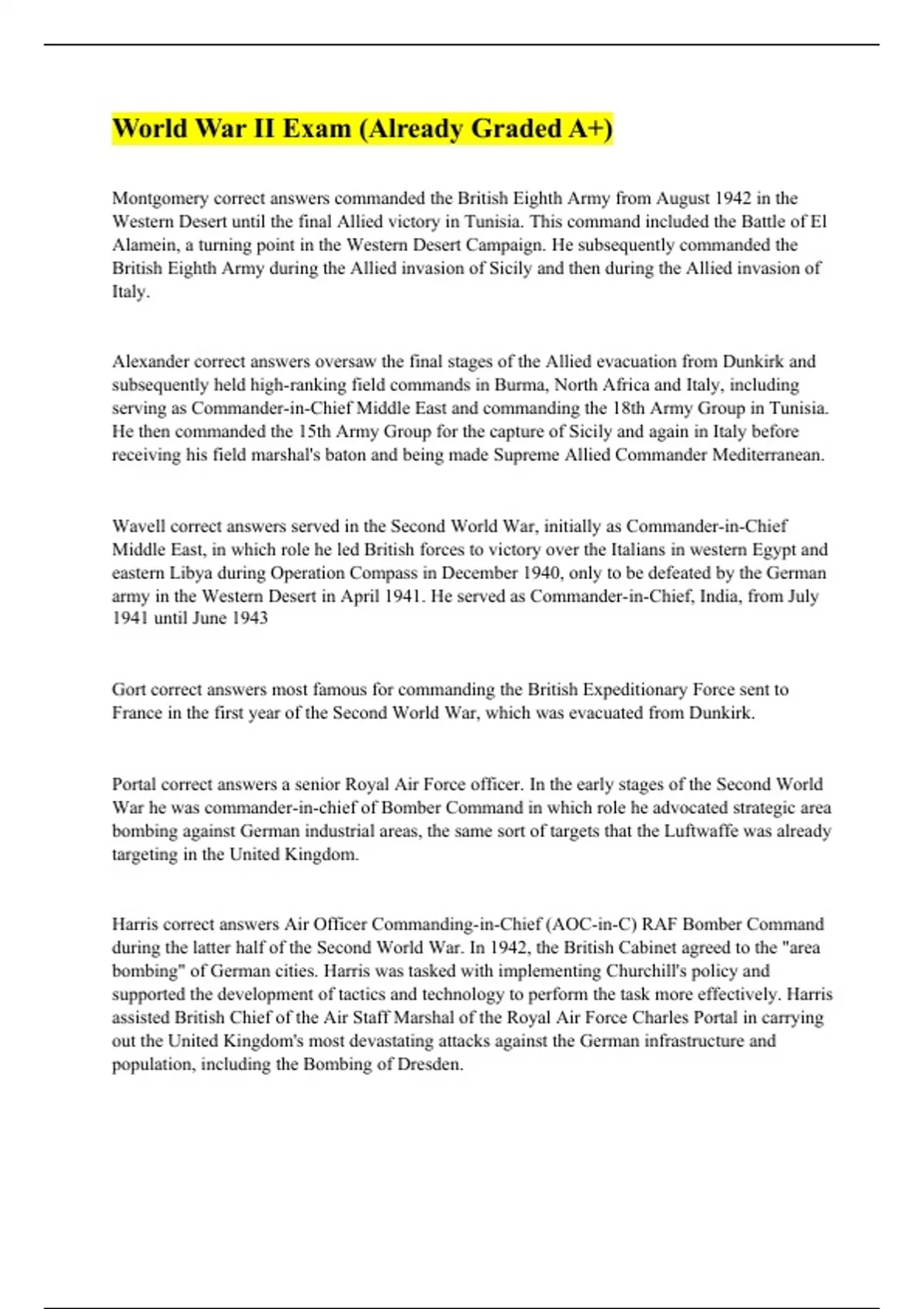Montgomery correct answers commanded the British Eighth Army from August 1942 in the Western Desert until the final Allied victory in Tunisia. This command included the Battle of El Alamein, a turning point in the Western Desert Campaign. He subsequently commanded the British Eighth Army during the Allied invasion of Sicily and then during the Allied invasion of Italy. Alexander correct answers oversaw the final stages of the Allied evacuation from Dunkirk and subsequently held high-ranking field commands in Burma, North Africa and Italy, including serving as Commander-in-Chief Middle East and commanding the 18th Army Group in Tunisia. He then commanded the 15th Army Group for the capture of Sicily and again in Italy before receiving his field marshal's baton and being made Supreme Allied Commander Mediterranean. Wavell correct answers served in the Second World War, initially as Commander-in-Chief Middle East, in which role he led British forces to victory over the Italians in western Egypt and eastern Libya during Operation Compass in December 1940, only to be defeated by the German army in the Western Desert in April 1941. He served as Commander-in-Chief, India, from July 1941 until June 1943 Gort correct answers most famous for commanding the British Expeditionary Force sent to France in the first year of the Second World War, which was evacuated from Dunkirk. Portal correct answers a senior Royal Air Force officer. In the early stages of the Second World War he was commander-in-chief of Bomber Command in which role he advocated strategic area bombing against German industrial areas, the same sort of targets that the Luftwaffe was already targeting in the United Kingdom. Harris correct answers Air Officer Commanding-in-Chief (AOC-in-C) RAF Bomber Command during the latter half of the Second World War. In 1942, the British Cabinet agreed to the "area bombing" of German cities. Harris was tasked with implementing Churchill's policy and supported the development of tactics and technology to perform the task more effectively. Harris assisted British Chief of the Air Staff Marshal of the Royal Air Force Charles Portal in carrying out the United Kingdom's most devastating attacks against the German infrastructure and population, including the Bombing of Dresden.