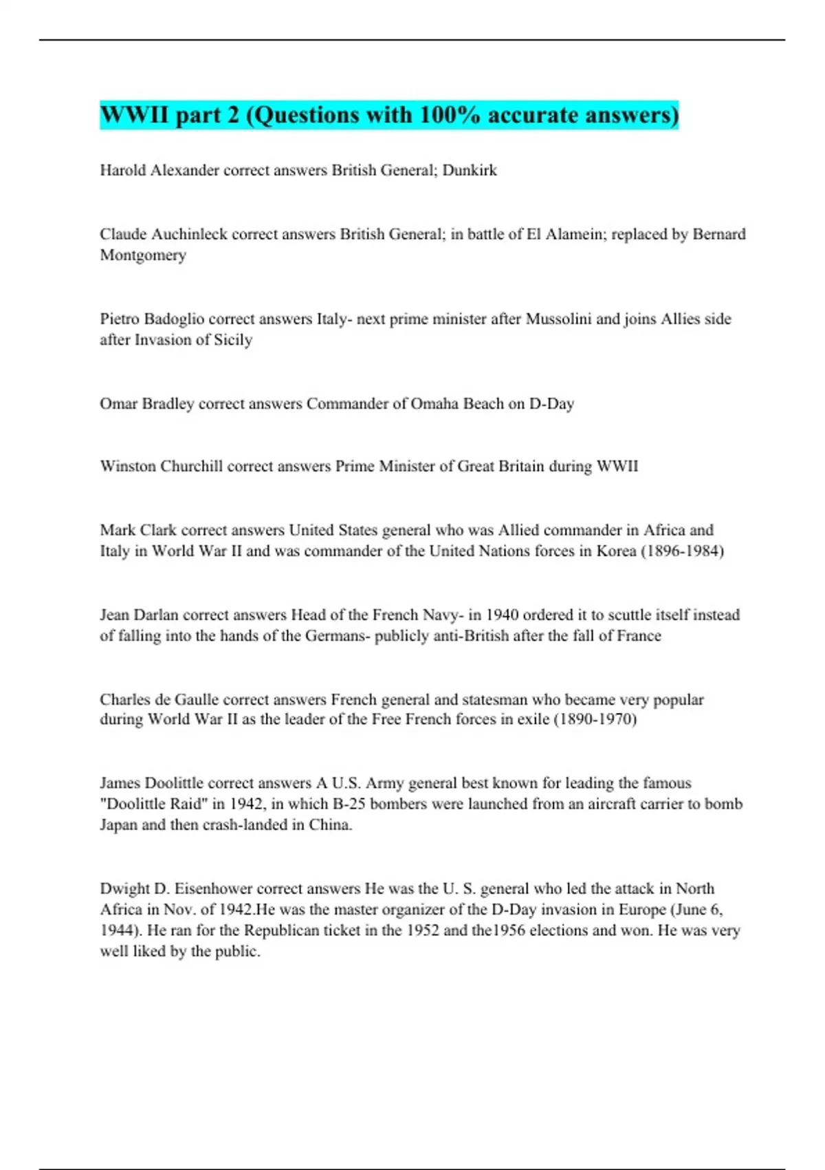Harold Alexander correct answers British General; Dunkirk Claude Auchinleck correct answers British General; in battle of El Alamein; replaced by Bernard Montgomery Pietro Badoglio correct answers Italy- next prime minister after Mussolini and joins Allies side after Invasion of Sicily Omar Bradley correct answers Commander of Omaha Beach on D-Day Winston Churchill correct answers Prime Minister of Great Britain during WWII Mark Clark correct answers United States general who was Allied commander in Africa and Italy in World War II and was commander of the United Nations forces in Korea () Jean Darlan correct answers Head of the French Navy- in 1940 ordered it to scuttle itself instead of falling into the hands of the Germans- publicly anti-British after the fall of France Charles de Gaulle correct answers French general and statesman who became very popular during World War II as the leader of the Free French forces in exile () James Doolittle correct answers A U.S. Army general best known for leading the famous "Doolittle Raid" in 1942, in which B-25 bombers were launched from an aircraft carrier to bomb Japan and then crash-landed in China. Dwight D. Eisenhower correct answers He was the U. S. general who led the attack in North Africa in Nov. of 1942.He was the master organizer of the D-Day invasion in Europe (June 6, 1944). He ran for the Republican ticket in the 1952 and the1956 elections and won. He was very well liked by the public.