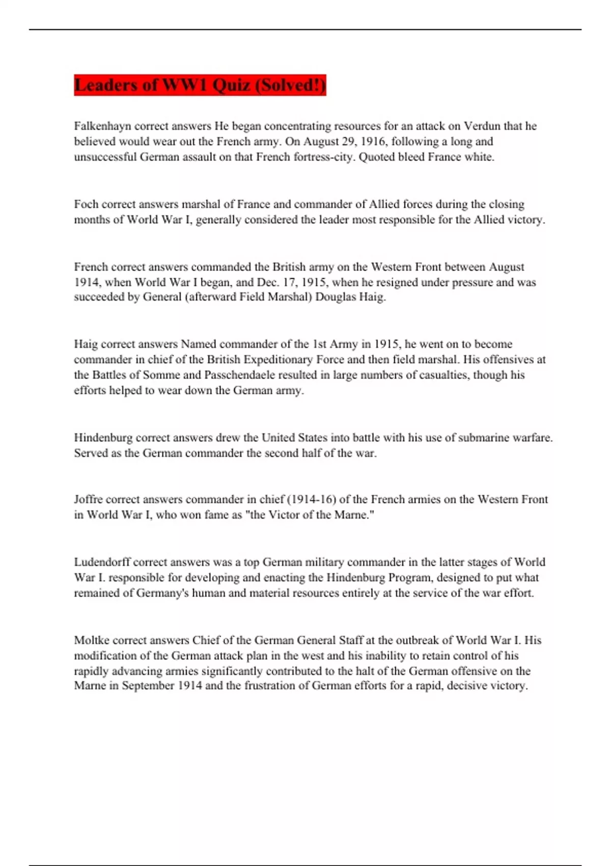 Falkenhayn correct answers He began concentrating resources for an attack on Verdun that he believed would wear out the French army. On August 29, 1916, following a long and unsuccessful German assault on that French fortress-city. Quoted bleed France white. Foch correct answers marshal of France and commander of Allied forces during the closing months of World War I, generally considered the leader most responsible for the Allied victory. French correct answers commanded the British army on the Western Front between August 1914, when World War I began, and Dec. 17, 1915, when he resigned under pressure and was succeeded by General (afterward Field Marshal) Douglas Haig. Haig correct answers Named commander of the 1st Army in 1915, he went on to become commander in chief of the British Expeditionary Force and then field marshal. His offensives at the Battles of Somme and Passchendaele resulted in large numbers of casualties, though his efforts helped to wear down the German army. Hindenburg correct answers drew the United States into battle with his use of submarine warfare. Served as the German commander the second half of the war. Joffre correct answers commander in chief (1914-16) of the French armies on the Western Front in World War I, who won fame as "the Victor of the Marne." Ludendorff correct answers was a top German military commander in the latter stages of World War I. responsible for developing and enacting the Hindenburg Program, designed to put what remained of Germany's human and material resources entirely at the service of the war effort. Moltke correct answers Chief of the German General Staff at the outbreak of World War I. His modification of the German attack plan in the west and his inability to retain control of his rapidly advancing armies significantly contributed to the halt of the German offensive on the Marne in September 1914 and the frustration of German efforts for a rapid, decisive victory.