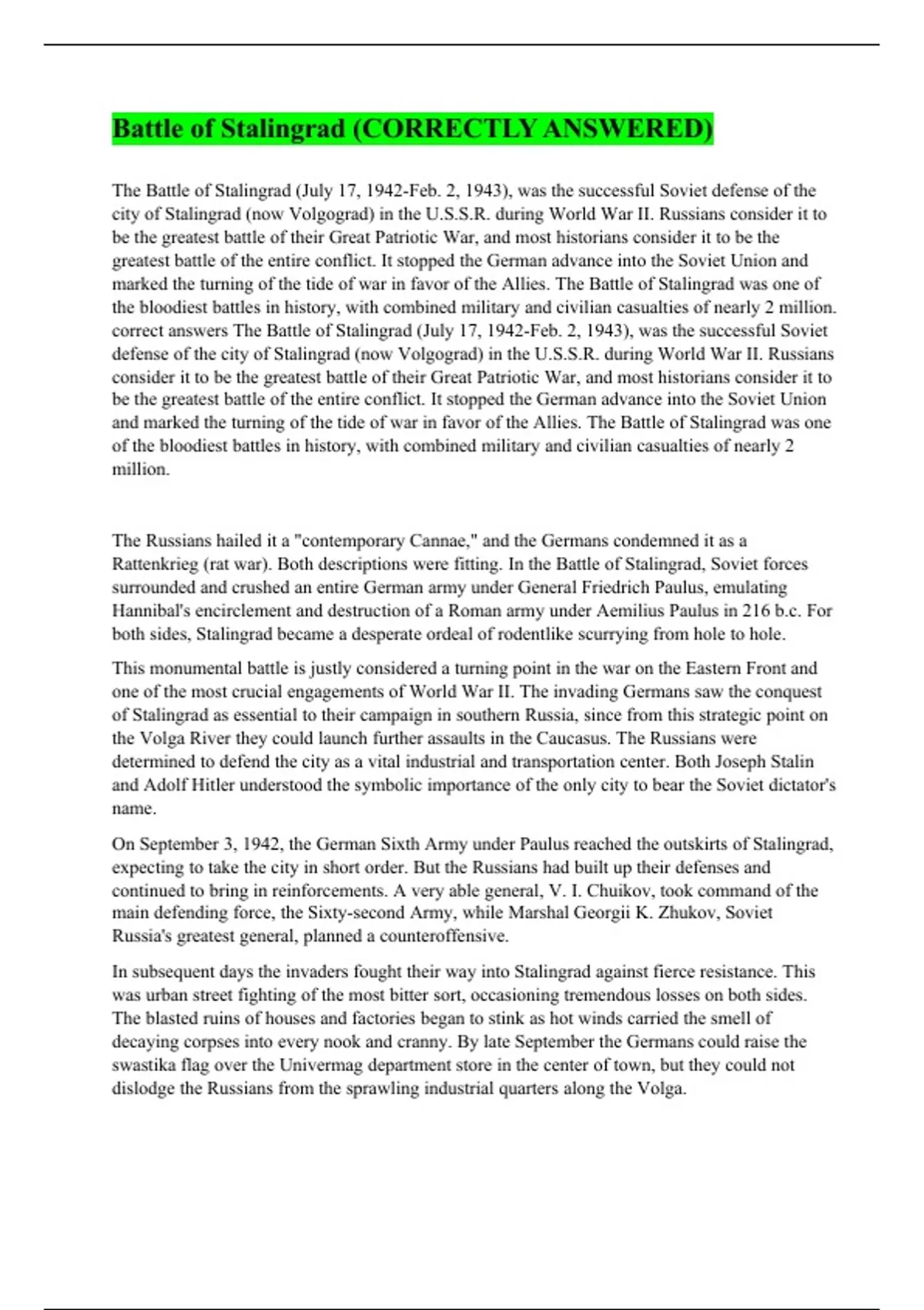 The Battle of Stalingrad (July 17, 1942-Feb. 2, 1943), was the successful Soviet defense of the city of Stalingrad (now Volgograd) in the U.S.S.R. during World War II. Russians consider it to be the greatest battle of their Great Patriotic War, and most historians consider it to be the greatest battle of the entire conflict. It stopped the German advance into the Soviet Union and marked the turning of the tide of war in favor of the Allies. The Battle of Stalingrad was one of the bloodiest battles in history, with combined military and civilian casualties of nearly 2 million. correct answers The Battle of Stalingrad (July 17, 1942-Feb. 2, 1943), was the successful Soviet defense of the city of Stalingrad (now Volgograd) in the U.S.S.R. during World War II. Russians consider it to be the greatest battle of their Great Patriotic War, and most historians consider it to be the greatest battle of the entire conflict. It stopped the German advance into the Soviet Union and marked the turning of the tide of war in favor of the Allies. The Battle of Stalingrad was one of the bloodiest battles in history, with combined military and civilian casualties of nearly 2 million. The Russians hailed it a "contemporary Cannae," and the Germans condemned it as a Rattenkrieg (rat war). Both descriptions were fitting. In the Battle of Stalingrad, Soviet forces surrounded and crushed an entire German army under General Friedrich Paulus, emulating Hannibal's encirclement and destruction of a Roman army under Aemilius Paulus in 216 b.c. For both sides, Stalingrad became a desperate ordeal of rodentlike scurrying from hole to hole. This monumental battle is justly considered a turning point in the war on the Eastern Front and one of the most crucial engagements of World War II. The invading Germans saw the conquest of Stalingrad as essential to their campaign in southern Russia, since from this strategic point on the Volga River they could launch further assaults in the Caucasus. The Russians were determined to defend the city as a vital industrial and transportation center. Both Joseph Stalin and Adolf Hitler understood the symbolic importance of the only city to bear the Soviet dictator's name. On September 3, 1942, the German Sixth Army under Paulus reached the outskirts of Stalingrad, expecting to take the city in short order. But the Russians had built up their defenses and continued to bring in reinforcements. A very able general, V. I. Chuikov, took command of the main defending force, the Sixty-second Army, while Marshal Georgii K. Zhukov, Soviet Russia's greatest general, planned a counteroffensive. In subsequent days the invaders fought their way into Stalingrad against fierce resistance. This was urban street fighting of the most bitter sort, occasioning tremendous losses on both sides. The blasted ruins of houses and factories began to stink as hot winds carried the smell of decaying corpses into every nook and cranny. By late September the Germans could raise the swastika flag over the Univermag department store in the center of town, but they could not dislodge the Russians from the sprawling industrial quarters along the Volga.