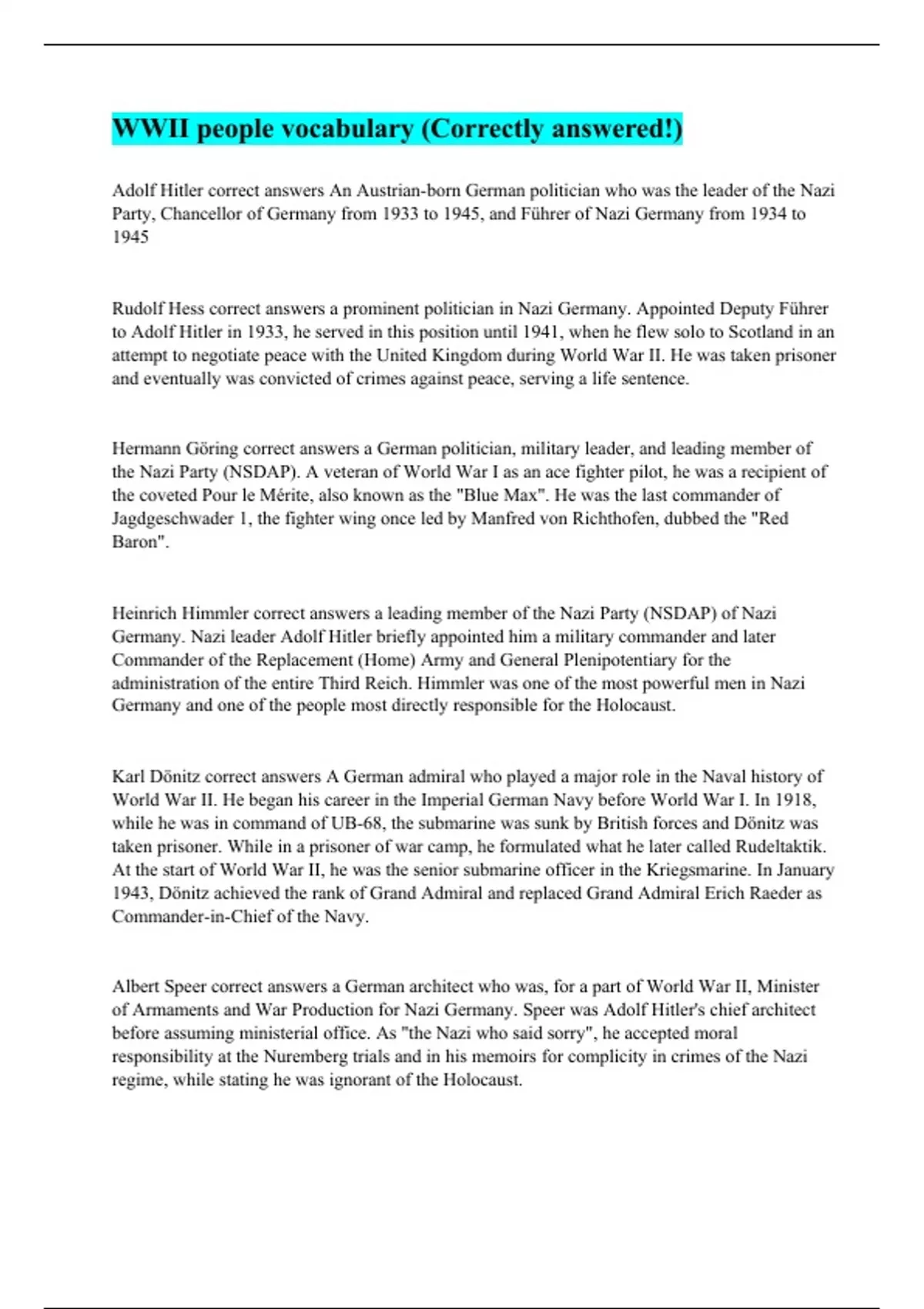 Adolf Hitler correct answers An Austrian-born German politician who was the leader of the Nazi Party, Chancellor of Germany from 1933 to 1945, and Führer of Nazi Germany from 1934 to 1945 Rudolf Hess correct answers a prominent politician in Nazi Germany. Appointed Deputy Führer to Adolf Hitler in 1933, he served in this position until 1941, when he flew solo to Scotland in an attempt to negotiate peace with the United Kingdom during World War II. He was taken prisoner and eventually was convicted of crimes against peace, serving a life sentence. Hermann Göring correct answers a German politician, military leader, and leading member of the Nazi Party (NSDAP). A veteran of World War I as an ace fighter pilot, he was a recipient of the coveted Pour le Mérite, also known as the "Blue Max". He was the last commander of Jagdgeschwader 1, the fighter wing once led by Manfred von Richthofen, dubbed the "Red Baron". Heinrich Himmler correct answers a leading member of the Nazi Party (NSDAP) of Nazi Germany. Nazi leader Adolf Hitler briefly appointed him a military commander and later Commander of the Replacement (Home) Army and General Plenipotentiary for the administration of the entire Third Reich. Himmler was one of the most powerful men in Nazi Germany and one of the people most directly responsible for the Holocaust. Karl Dönitz correct answers A German admiral who played a major role in the Naval history of World War II. He began his career in the Imperial German Navy before World War I. In 1918, while he was in command of UB-68, the submarine was sunk by British forces and Dönitz was taken prisoner. While in a prisoner of war camp, he formulated what he later called Rudeltaktik. At the start of World War II, he was the senior submarine officer in the Kriegsmarine. In January 1943, Dönitz achieved the rank of Grand Admiral and replaced Grand Admiral Erich Raeder as Commander-in-Chief of the Navy. Albert Speer correct answers a German architect who was, for a part of World War II, Minister of Armaments and War Production for Nazi Germany. Speer was Adolf Hitler's chief architect before assuming ministerial office. As "the Nazi who said sorry", he accepted moral responsibility at the Nuremberg trials and in his memoirs for complicity in crimes of the Nazi regime, while stating he was ignorant of the Holocaust.