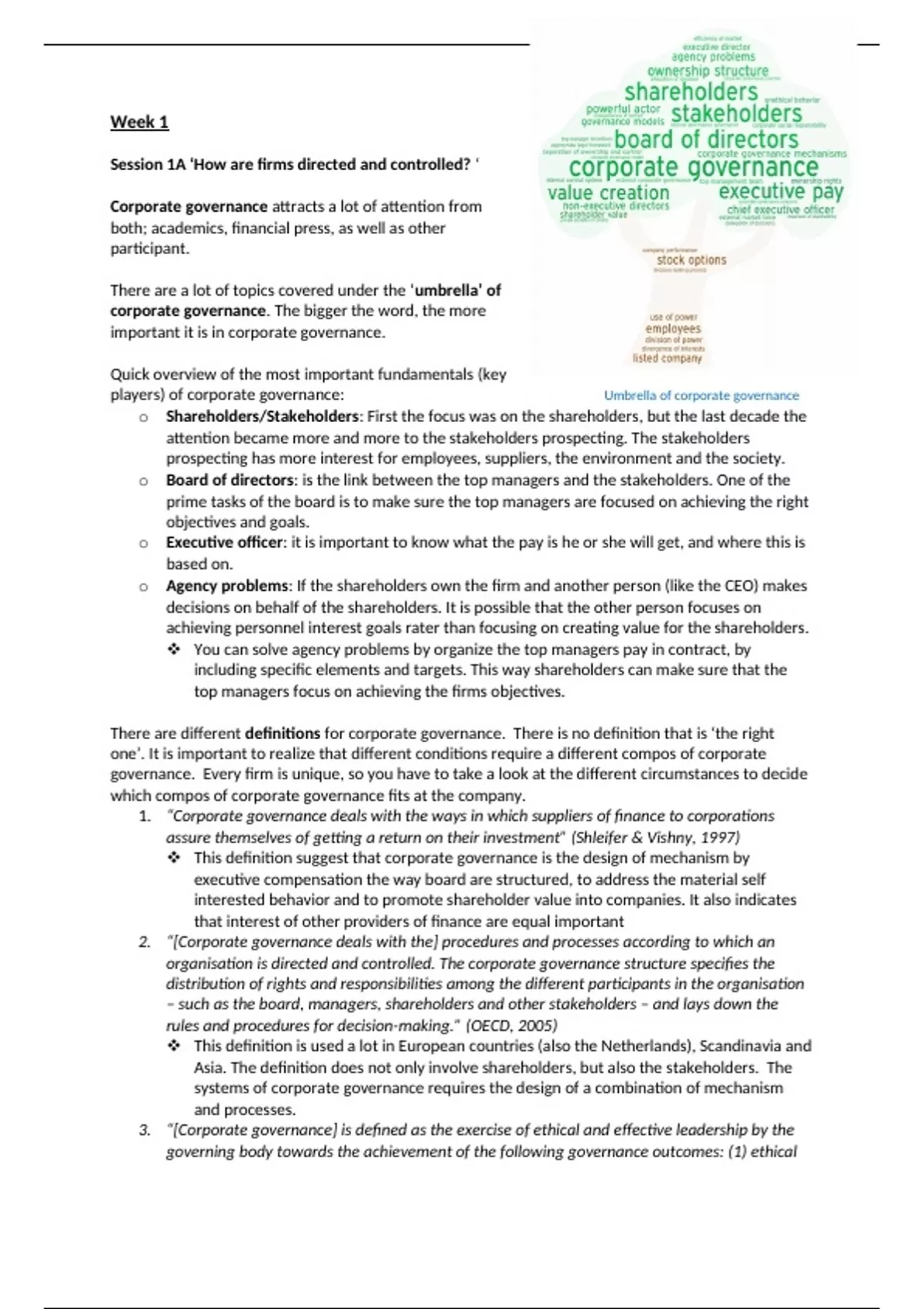 Summary Corporate Governance - How are firms directed and controlled? - fundamentals of Agency theory - The board of directors: basics’ What does the board of directors? - ‘One-tier vs two-tier systems - Board independence - CEO duality - Board capital - Board processes - Executive compensation - Determining CEO pay Tow views - The risk of executive compensation - Executive pay gaps - CSR contracting - The role of shareholders -