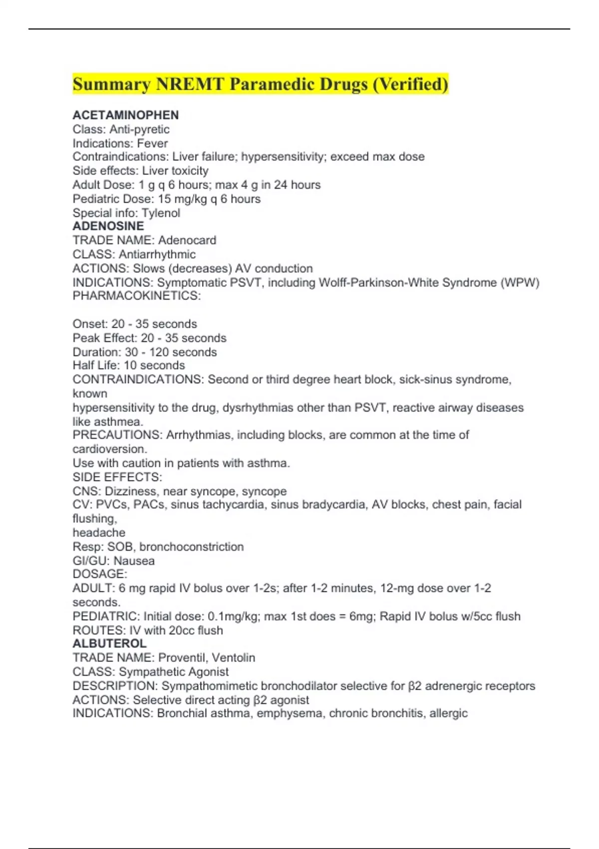 Summary NREMT Paramedic Drugs (Verified) ACETAMINOPHEN Class: Anti-pyretic Indications: Fever Contraindications: Liver failure; hypersensitivity; exceed max dose Side effects: Liver toxicity Adult Dose: 1 g q 6 hours; max 4 g in 24 hours Pediatric Dose: 15 mg/kg q 6 hours Special info: Tylenol ADENOSINE TRADE NAME: Adenocard CLASS: Antiarrhythmic ACTIONS: Slows (decreases) AV conduction INDICATIONS: Symptomatic PSVT, including Wolff-Parkinson-White Syndrome (WPW) PHARMACOKINETICS: Onset: 20 - 35 seconds Peak Effect: 20 - 35 seconds Duration: 30 - 120 seconds Half Life: 10 seconds CONTRAINDICATIONS: Second or third degree heart block, sick-sinus syndrome, known hypersensitivity to the drug, dysrhythmias other than PSVT, reactive airway diseases like asthmea. PRECAUTIONS: Arrhythmias, including blocks, are common at the time of cardioversion. Use with caution in patients with asthma. SIDE EFFECTS: CNS: Dizziness, near syncope, syncope CV: PVCs, PACs, sinus tachycardia, sinus bradycardia, AV blocks, chest pain, facial flushing,