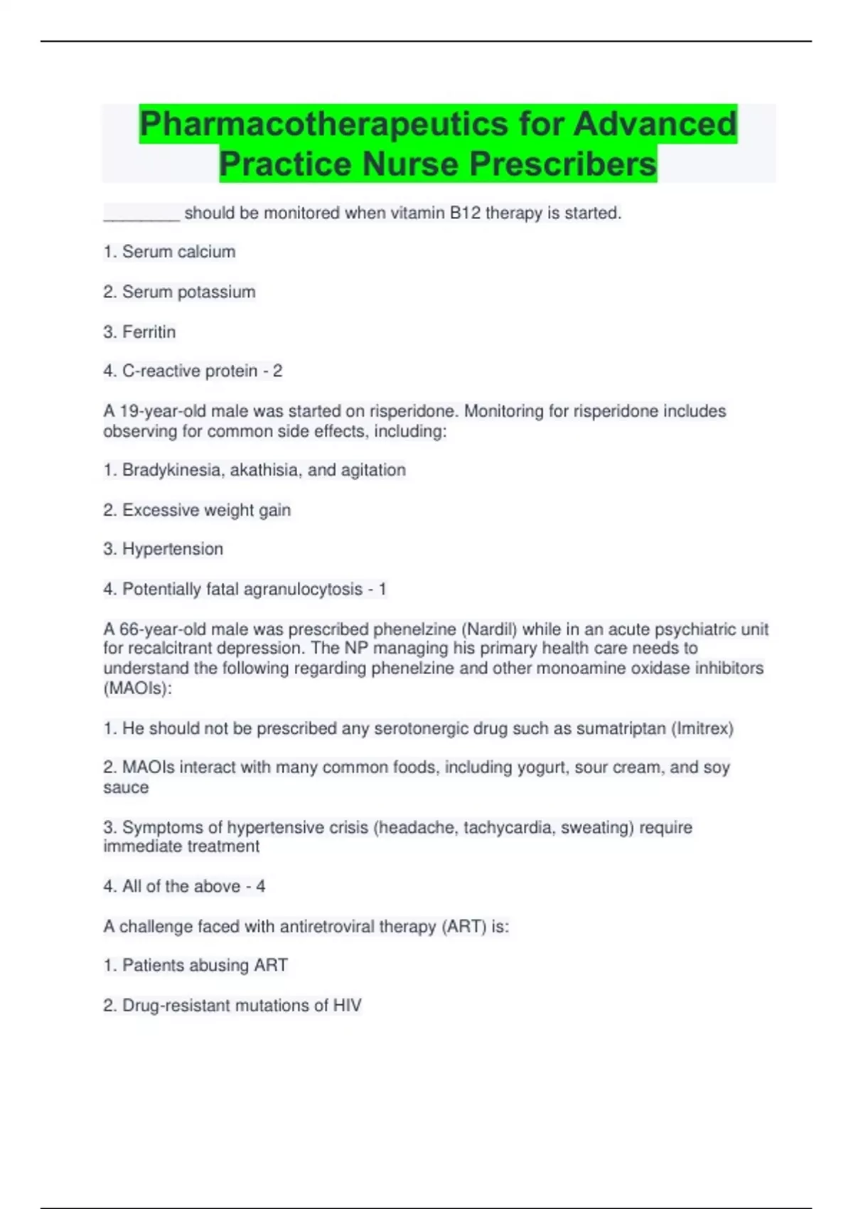 Pharmacotherapeutics for advanced practice Pharmacotherapeutics for Advanced Practice Nurse Prescribers ________ should be monitored when vitamin B12 therapy is started. 1. Serum calcium 2. Serum potassium 3. Ferritin 4. C-reactive protein - 2 A 19-year-old male was started on risperidone. Monitoring for risperidone includes observing for common side effects, including: 1. Bradykinesia, akathisia, and agitation 2. Excessive weight gain 3. Hypertension 4. Potentially fatal agranulocytosis - 1 A 66-year-old male was prescribed phenelzine (Nardil) while in an acute psychiatric unit for recalcitrant depression. The NP managing his primary health care needs to understand the following regarding phenelzine and other monoamine oxidase inhibitors (MAOIs): 1. He should not be prescribed any serotonergic drug such as sumatriptan (Imitrex) 2. MAOIs interact with many common foods, including yogurt, sour cream, and soy sauce 3. Symptoms of hypertensive crisis (headache, tachycardia, sweating) require immediate treatment 4. All of the above - 4 A challenge faced with antiretroviral therapy (ART) is: 1. Patients abusing ART 2. Drug-resistant mutations of HIV 3. Reduction of transmissibility of HIV 4. Lack of efficacy data - 2 A comprehensive assessment of a patient should be holistic when trying to determine competence in drug administration. Which of the following factors would the NP omit from this type of assessment? 1. Financial status 2. Mobility 3. Social support 4. Sexual practices - 4 A first-line drug for abortive therapy in simple migraine is: 1. Sumatriptan (Imitrex) 2. Naproxen (Aleve) 3. Butorphanol nasal spray (Stadol NS) 4. Butalbital and acetaminophen (Fioricet) - 2 A genetic variation in how the metabolite of the cancer drug irinotecan SN-38 is inactivated by the body may lead to: 1. Decreased effectiveness of irinotecan in the treatment of cancer 2. Increased adverse drug reactions, such as neutropenia 3. Delayed metabolism of the prodrug irinotecan into the active metabolite SN-38 4. Increased concerns for irinotecan being carcinogenic - 2 A good history of herb and supplement use is critical before prescribing because approximately ____ % of patients in the United States are using herbal products. 1. 10 2. 5 3. 38 4. 70 - 3 A low-carbohydrate, high-protein diet may: 1. Increase drug-metabolizing enzymes 2. Decrease drug absorption from the GI tract 3. Alter drug binding to plasma proteins 4. Enhance drug elimination - 1 A number of barriers and concerns exist before the goals of a safe and efficient information technology (IT) system can be realized. Which of the following is NOT a barrier to adoption and use of IT in prescribing drugs? 1. Cost of initial setup 2. Access to highly skilled experts 3. Compatibility between systems 4. Patient confidentiality risks - 2 A patient presents with a complaint of dark stools and epigastric pain described as gnawing and burning. Which of the medications is the most likely cause? 1. Acetaminophen 2. Estradiol 3. Donepezil 4. Bethanechol - 4