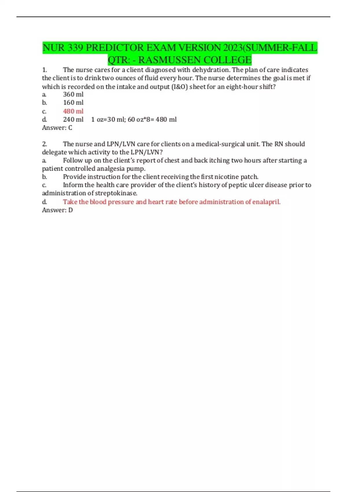 NUR 339 PREDICTOR EXAM VERSION 2023(SUMMER-FALL QTR: - RASMUSSEN COLLEGE