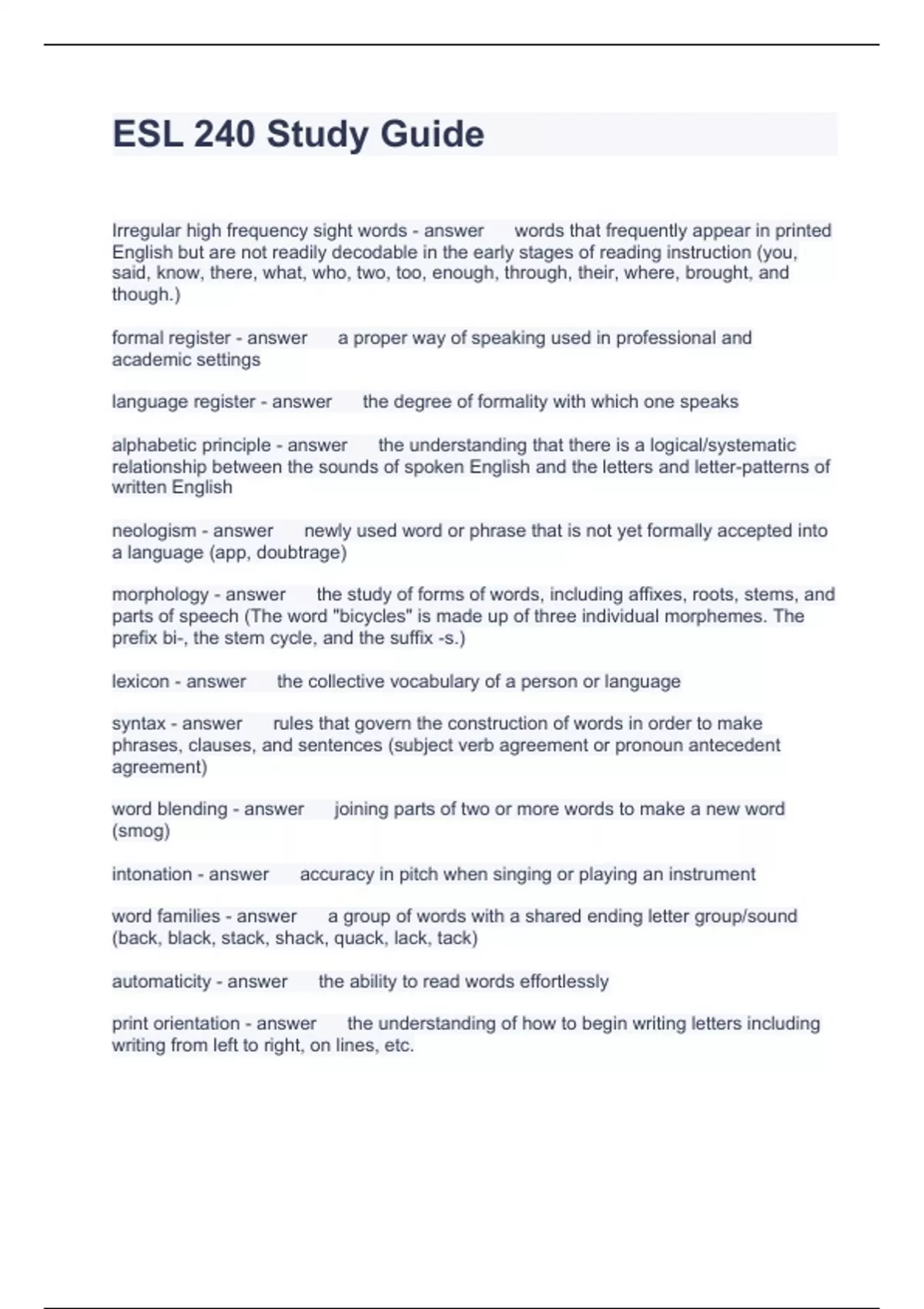 ESL 240 Study Guide Questions and Answers 2023