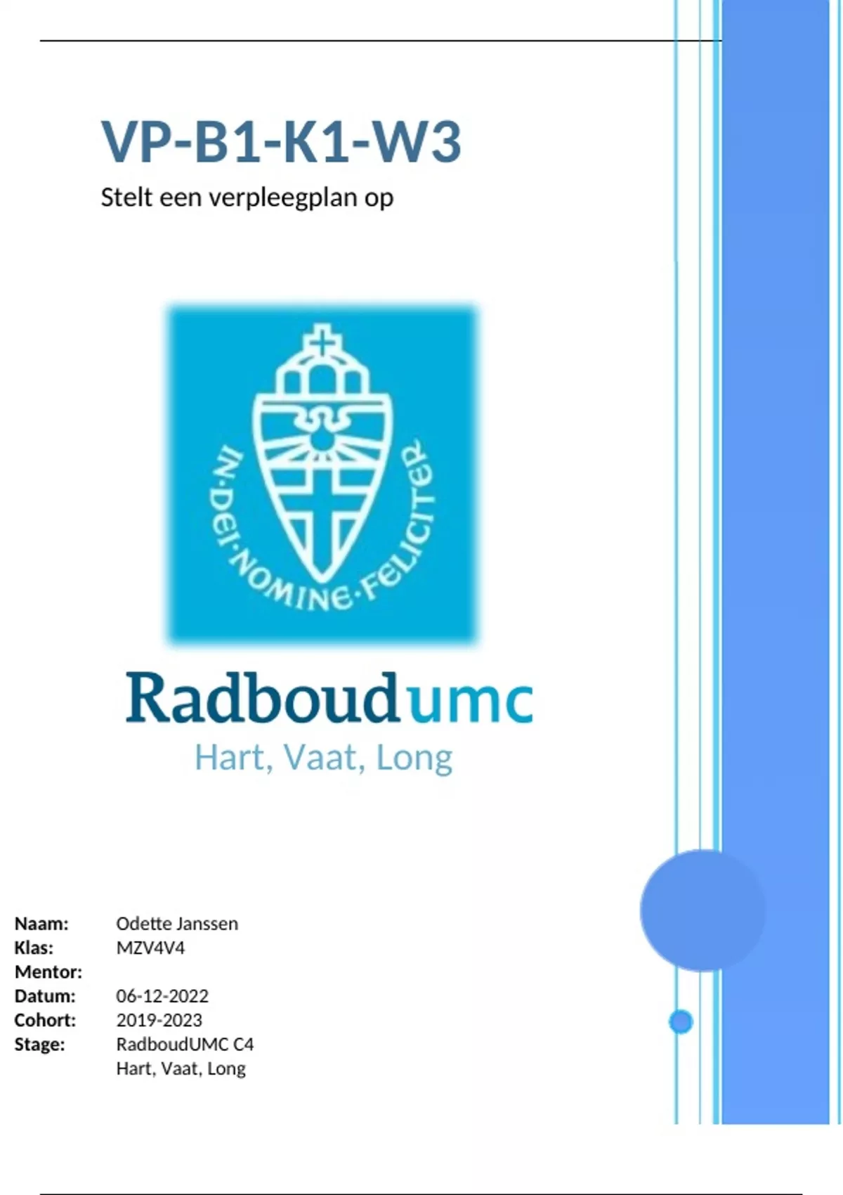 Op 06-12-2022 heb ik het examen VP-B1-K1-W3 ‘’Stelt een verpleegplan op’’ uitgevoerd. Op