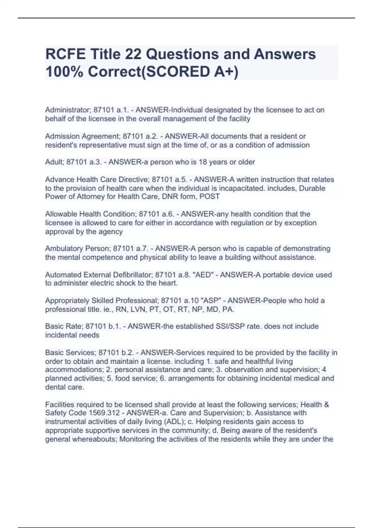 Administrator; 87101 a.1. - ANSWER-Individual designated by the licensee to act on behalf of the licensee in the overall management of the facility Admission Agreement; 87101 a.2. - ANSWER-All documents that a resident or resident's representative must sign at the time of, or as a condition of admission Adult; 87101 a.3. - ANSWER-a person who is 18 years or older Advance Health Care Directive; 87101 a.5. - ANSWER-A written instruction that relates to the provision of health care when the individual is incapacitated. includes, Durable Power of Attorney for Health Care, DNR form, POST Allowable Health Condition; 87101 a.6. - ANSWER-any health condition that the licensee is allowed to care for either in accordance with regulation or by exception approval by the agency Ambulatory Person; 87101 a.7. - ANSWER-A person who is capable of demonstrating the mental competence and physical ability to leave a building without assistance. Automated External Defibrillator; 87101 a.8. "AED" - ANSWER-A portable device used to administer electric shock to the heart. Appropriately Skilled Professional; 87101 a.10 "ASP" - ANSWER-People who hold a professional title. ie., RN, LVN, PT, OT, RT, NP, MD, PA.