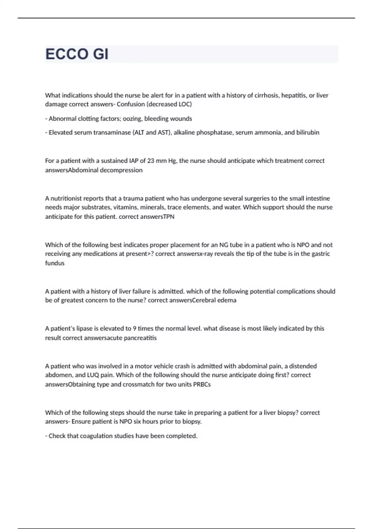 What indications should the nurse be alert for in a patient with a history of cirrhosis, hepatitis, or liver damage correct answers- Confusion (decreased LOC) - Abnormal clotting factors; oozing, bleeding wounds - Elevated serum transaminase (ALT and AST), alkaline phosphatase, serum ammonia, and bilirubin For a patient with a sustained IAP of 23 mm Hg, the nurse should anticipate which treatment correct answersAbdominal decompression A nutritionist reports that a trauma patient who has undergone several surgeries to the small intestine needs major substrates, vitamins, minerals, trace elements, and water. Which support should the nurse anticipate for this patient. correct answersTPN Which of the following best indicates proper placement for an NG tube in a patient who is NPO and not receiving any medications at present? correct answersx-ray reveals the tip of the tube is in the gastric fundus A patient with a history of liver failure is admitted. which of the following potential complications should be of greatest concern to the nurse? correct answersCerebral edema A patient's lipase is elevated to 9 times the normal level. what disease is most likely indicated by this result correct answersacute pancreatitis A patient who was involved in a motor vehicle crash is admitted with abdominal pain, a distended abdomen, and LUQ pain. Which of the following should the nurse anticipate doing first? correct answersObtaining type and crossmatch for two units PRBCs Which of the following steps should the nurse take in preparing a patient for a liver biopsy? correct answers- Ensure patient is NPO six hours prior to biopsy. - Check that coagulation studies have been completed.