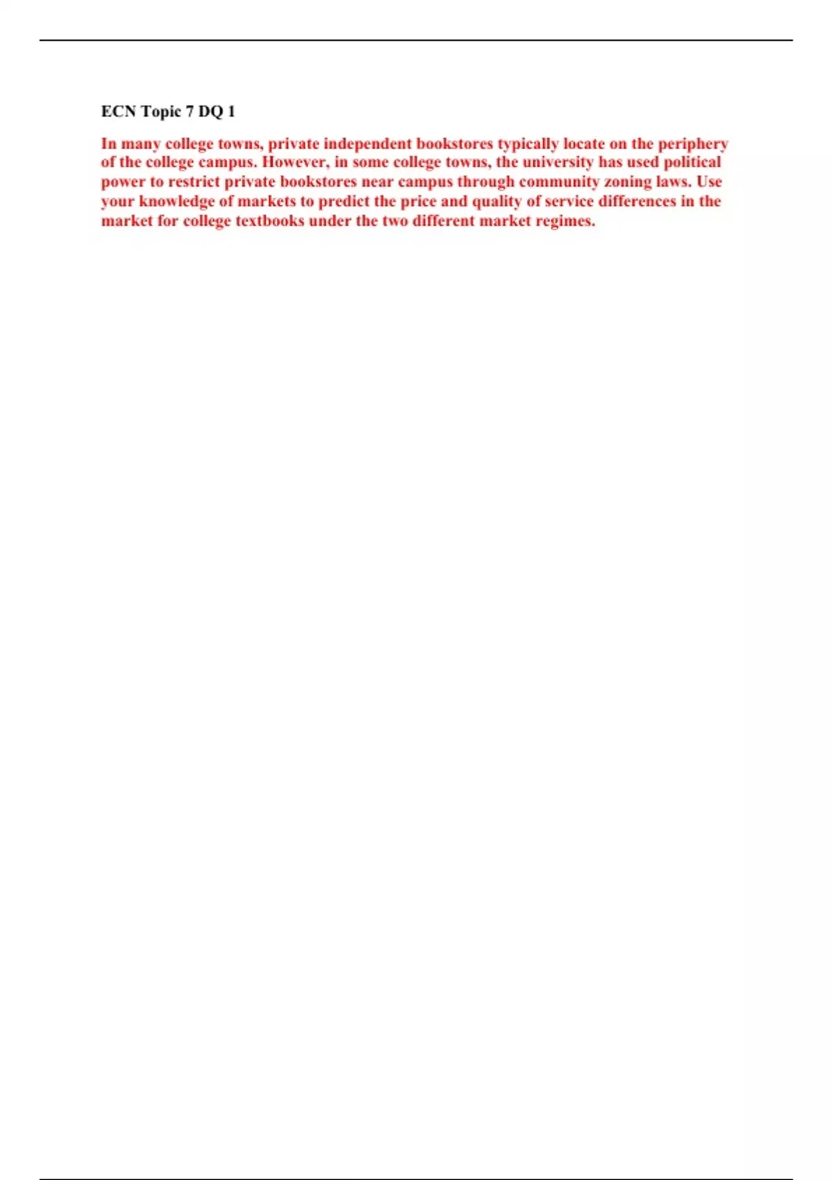 ECN Topic 7 DQ 1 In many college towns, private independent bookstores typically locate on the periphery of the college campus. However, in some college towns, the university has used political power to restrict private bookstores near campus through community zoning laws. Use your knowledge of markets to predict the price and quality of service differences in the market for college textbooks under the two different market regimes.