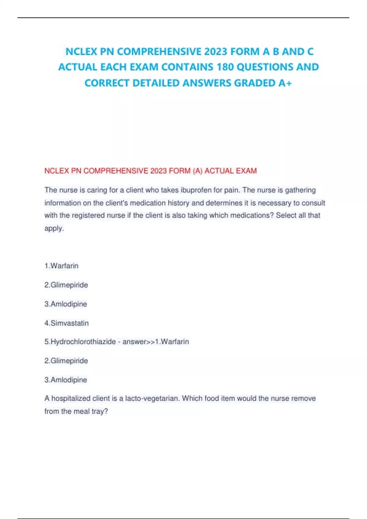 NCLEX PN COMPREHENSIVE 2023 FORM A B AND C ACTUAL EACH EXAM CONTAINS 180 QUESTIONS AND ANSWERS