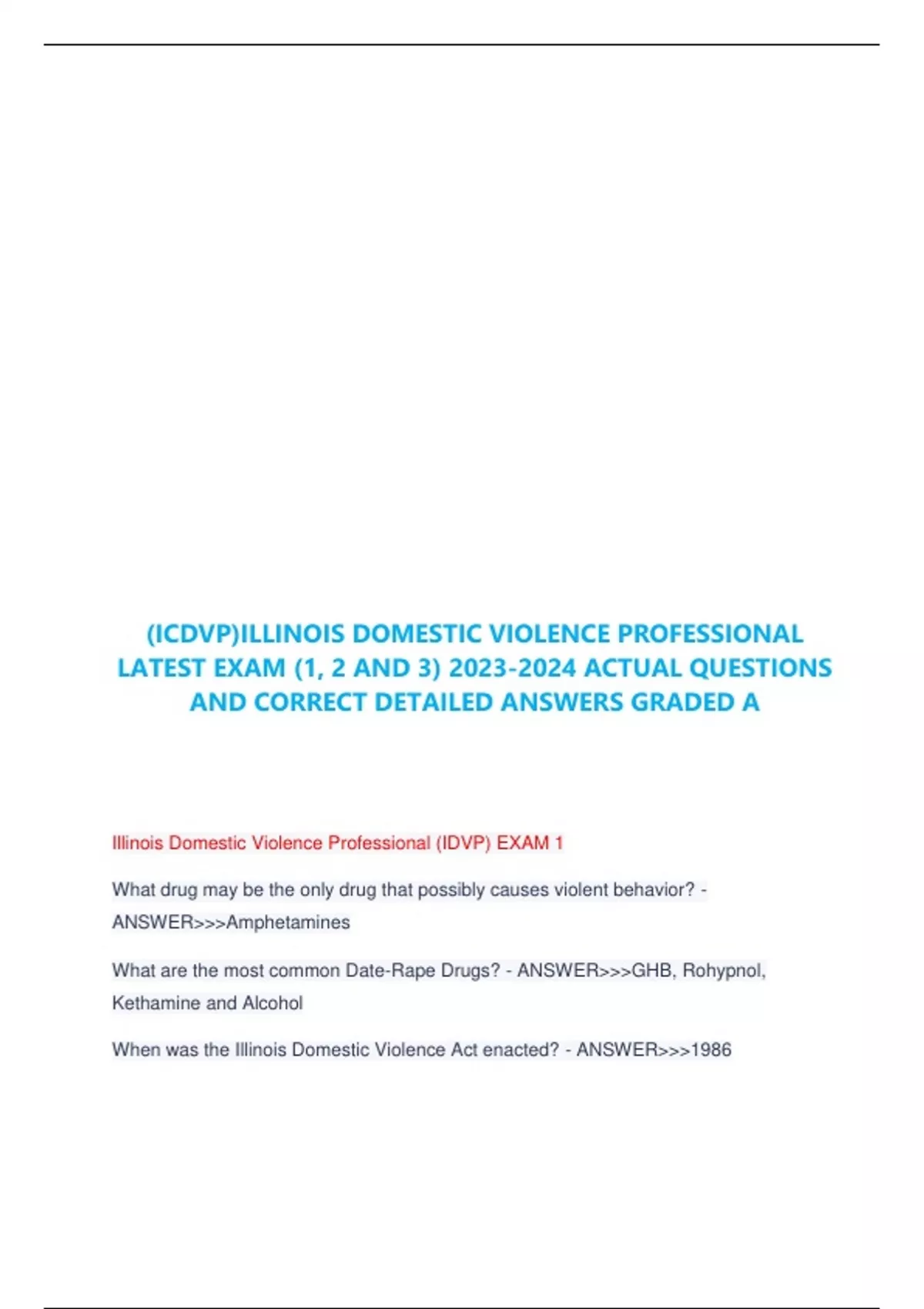 (ICDVP)ILLINOIS DOMESTIC VIOLENCE PROFESSIONAL LATEST EXAM (1, 2 AND 3)