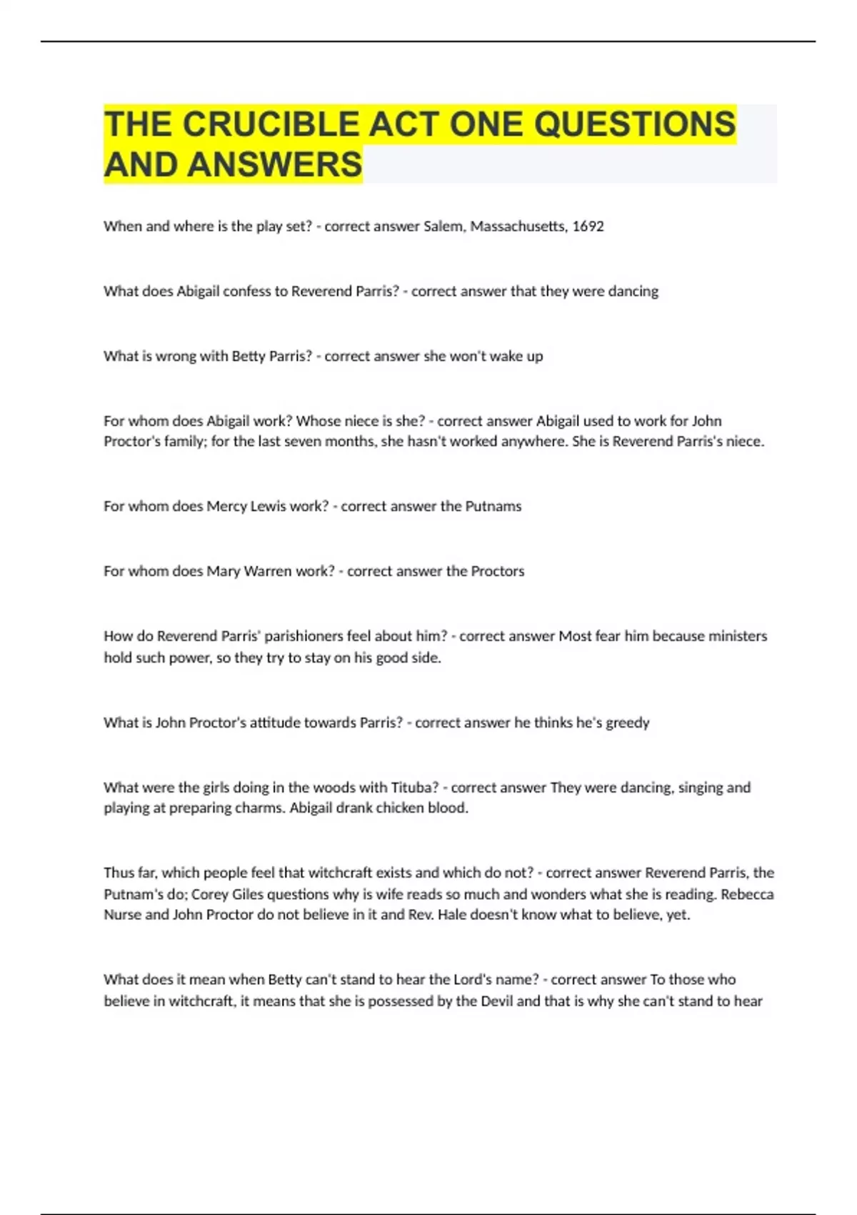 THE CRUCIBLE ACT ONE QUESTIONS AND ANSWERS