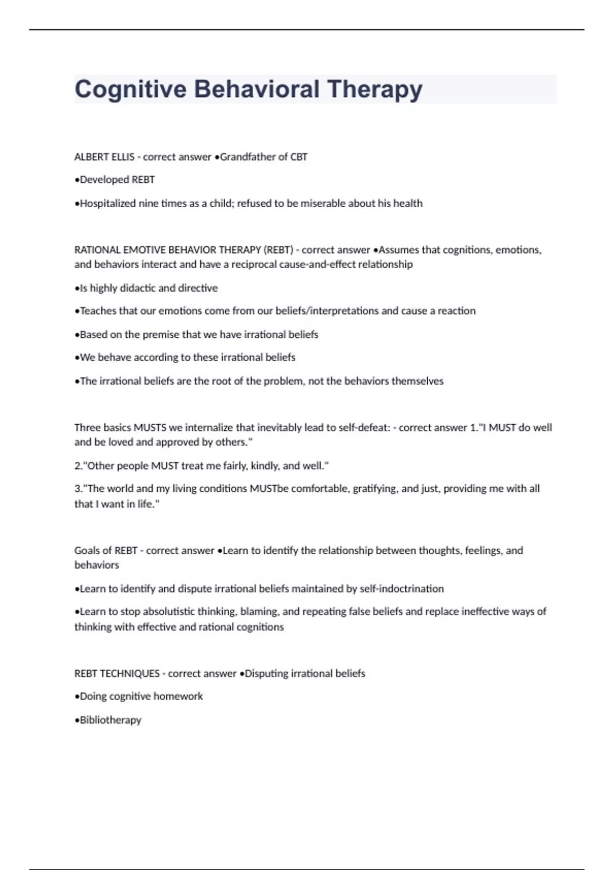 REBT TECHNIQUES - correct answer •Disputing irrational beliefs