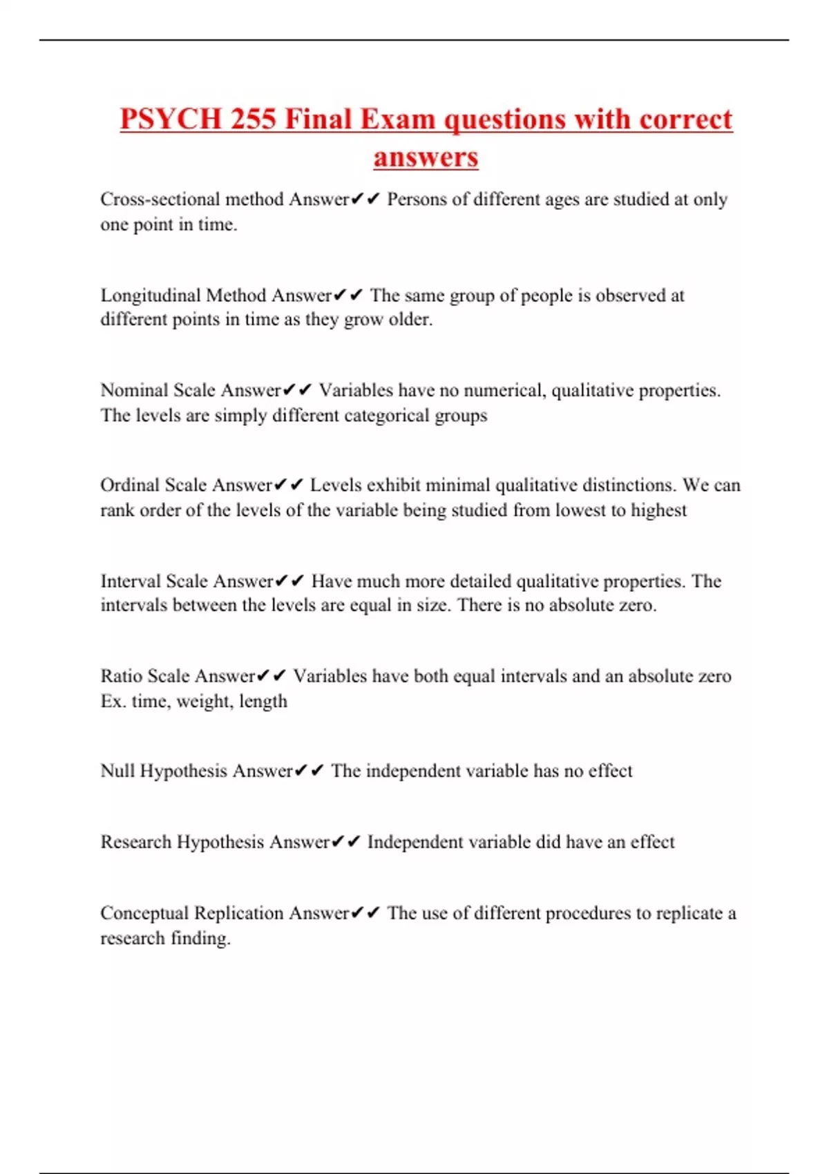 Cross-sectional method Answer Persons of different ages are studied at only one point in time. Longitudinal Method Answer The same group of people is observed at different points in time as they grow older. Nominal Scale Answer Variables have no numerical, qualitative properties. The levels are simply different categorical groups Ordinal Scale Answer Levels exhibit minimal qualitative distinctions. We can rank order of the levels of the variable being studied from lowest to highest Interval Scale Answer Have much more detailed qualitative properties. The intervals between the levels are equal in size. There is no absolute zero. Ratio Scale Answer Variables have both equal intervals and an absolute zero Ex. time, weight, length Null Hypothesis Answer The independent variable has no effect Research Hypothesis Answer Independent variable did have an effect Conceptual Replication Answer The use of different procedures to replicate a research finding.