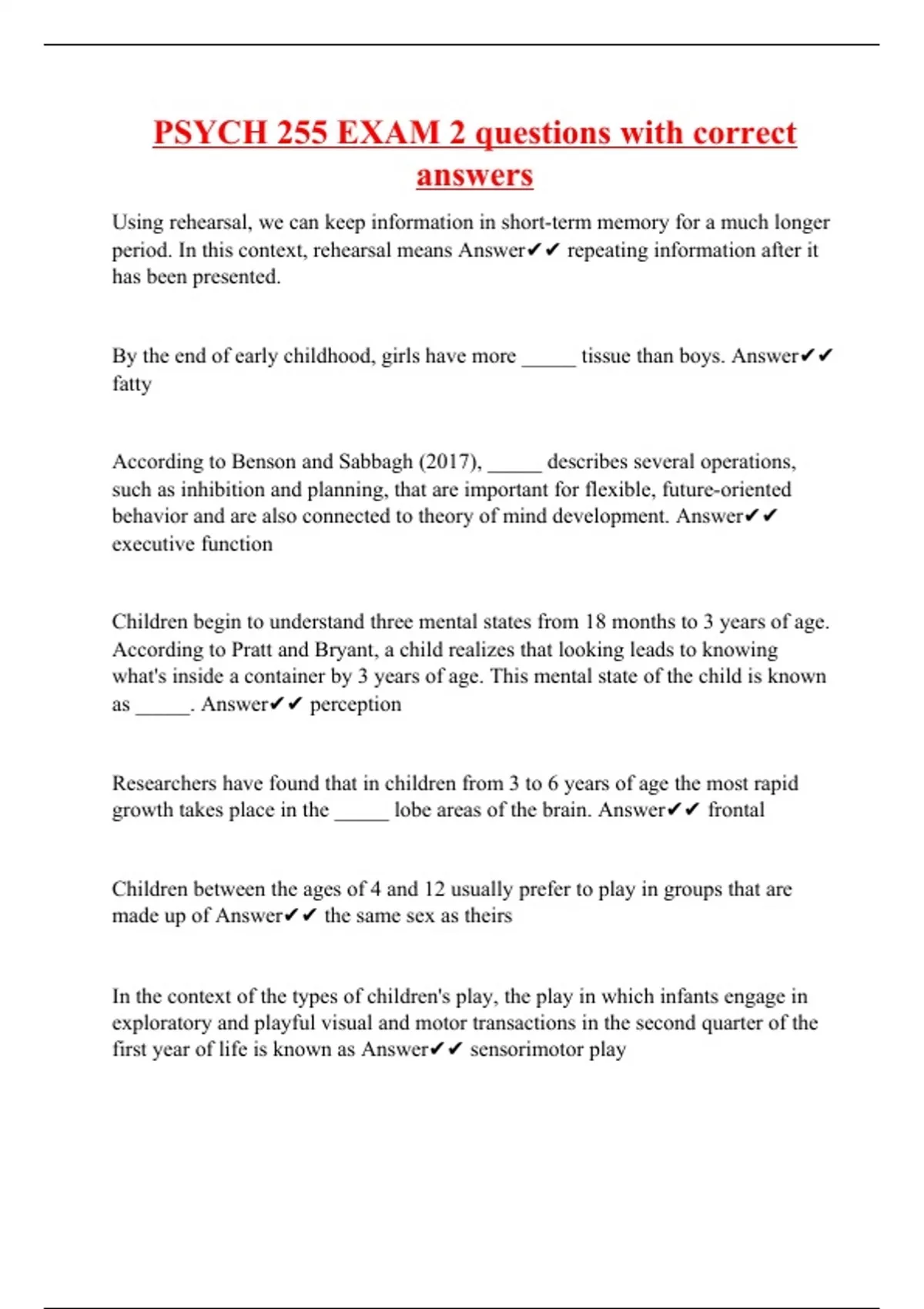 Using rehearsal, we can keep information in short-term memory for a much longer period. In this context, rehearsal means Answer repeating information after it has been presented. By the end of early childhood, girls have more _____ tissue than boys. Answer fatty According to Benson and Sabbagh (2017), _____ describes several operations, such as inhibition and planning, that are important for flexible, future-oriented behavior and are also connected to theory of mind development. Answer executive function Children begin to understand three mental states from 18 months to 3 years of age. According to Pratt and Bryant, a child realizes that looking leads to knowing what's inside a container by 3 years of age. This mental state of the child is known as _____. Answer perception Researchers have found that in children from 3 to 6 years of age the most rapid growth takes place in the _____ lobe areas of the brain. Answer frontal Children between the ages of 4 and 12 usually prefer to play in groups that are made up of Answer the same sex as theirs In the context of the types of children's play, the play in which infants engage in exploratory and playful visual and motor transactions in the second quarter of the first year of life is known as Answer sensor
