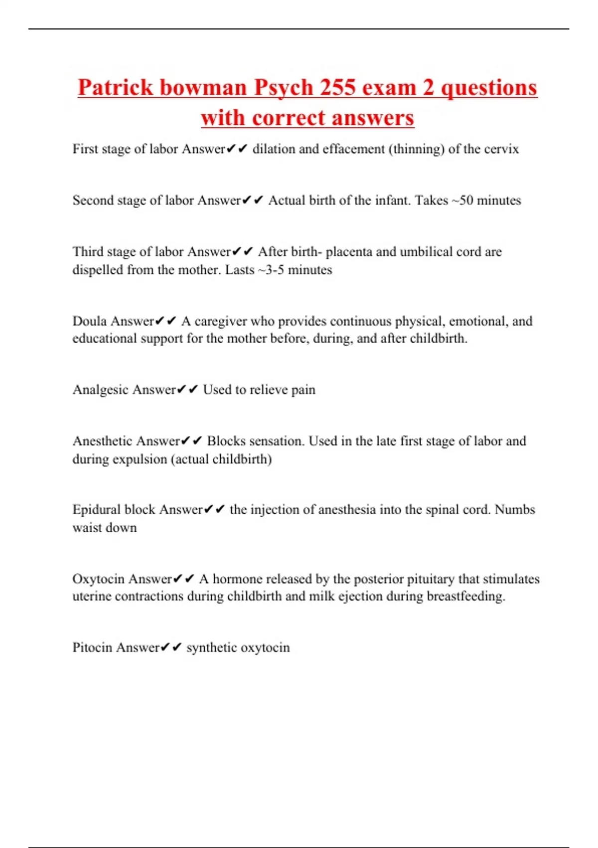 First stage of labor Answer dilation and effacement (thinning) of the cervix Second stage of labor Answer Actual birth of the infant. Takes ~50 minutes Third stage of labor Answer After birth- placenta and umbilical cord are dispelled from the mother. Lasts ~3-5 minutes Doula Answer A caregiver who provides continuous physical, emotional, and educational support for the mother before, during, and after childbirth. Analgesic Answer Used to relieve pain Anesthetic Answer Blocks sensation. Used in the late first stage of labor and during expulsion (actual childbirth) Epidural block Answer the injection of anesthesia into the spinal cord. Numbs waist down Oxytocin Answer A hormone released by the posterior pituitary that stimulates uterine contractions during childbirth and milk ejection during breastfeeding. Pitocin Answer synthetic oxytocin Prepared childbirth Answer method o
