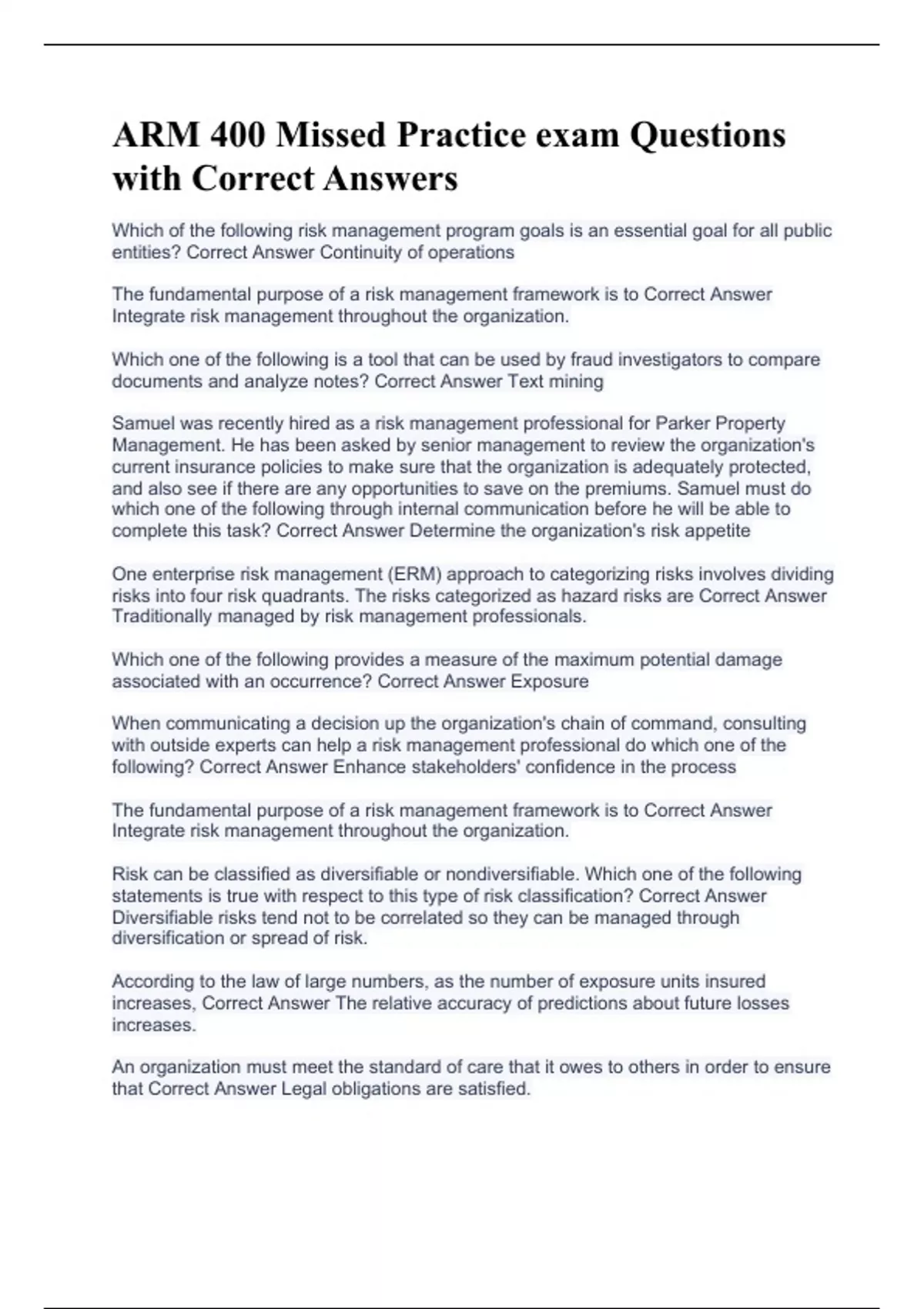 ARM 400 Missed Practice exam Questions with Correct Answers