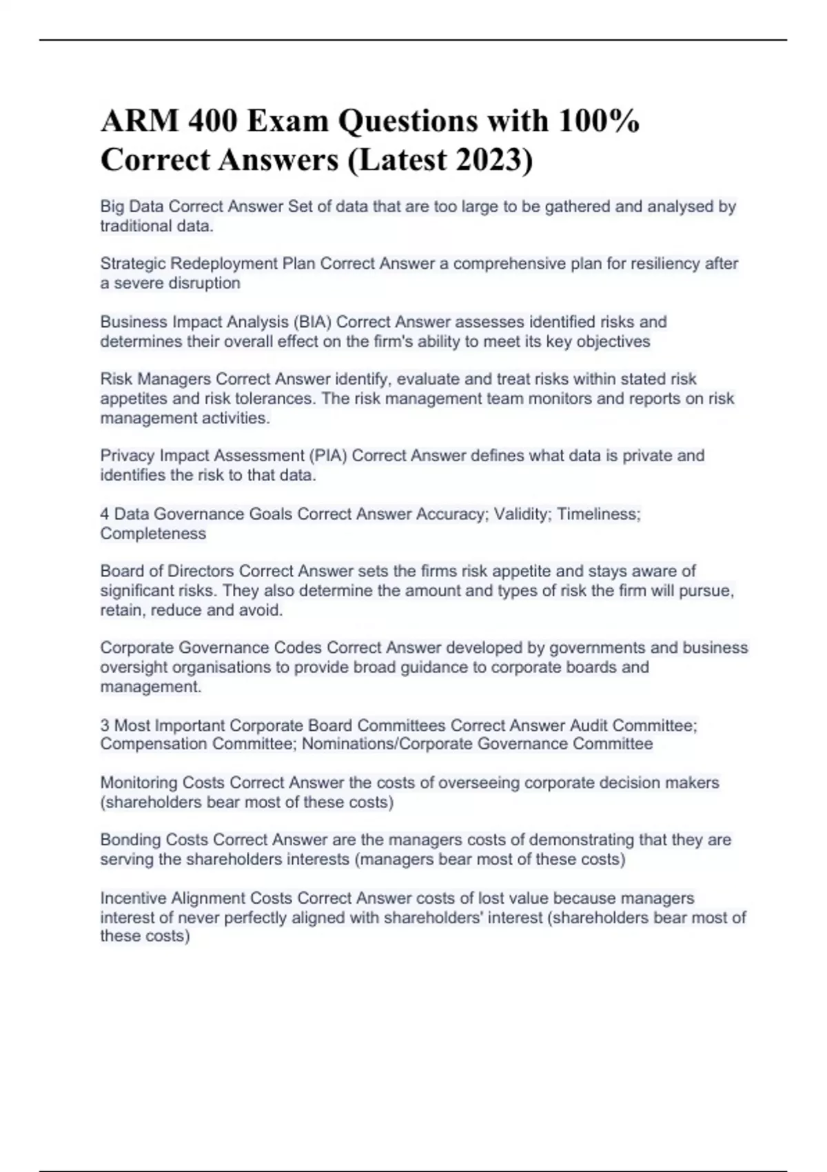 ARM 400 Exam Questions with 100% Correct Answers (Latest 2023)