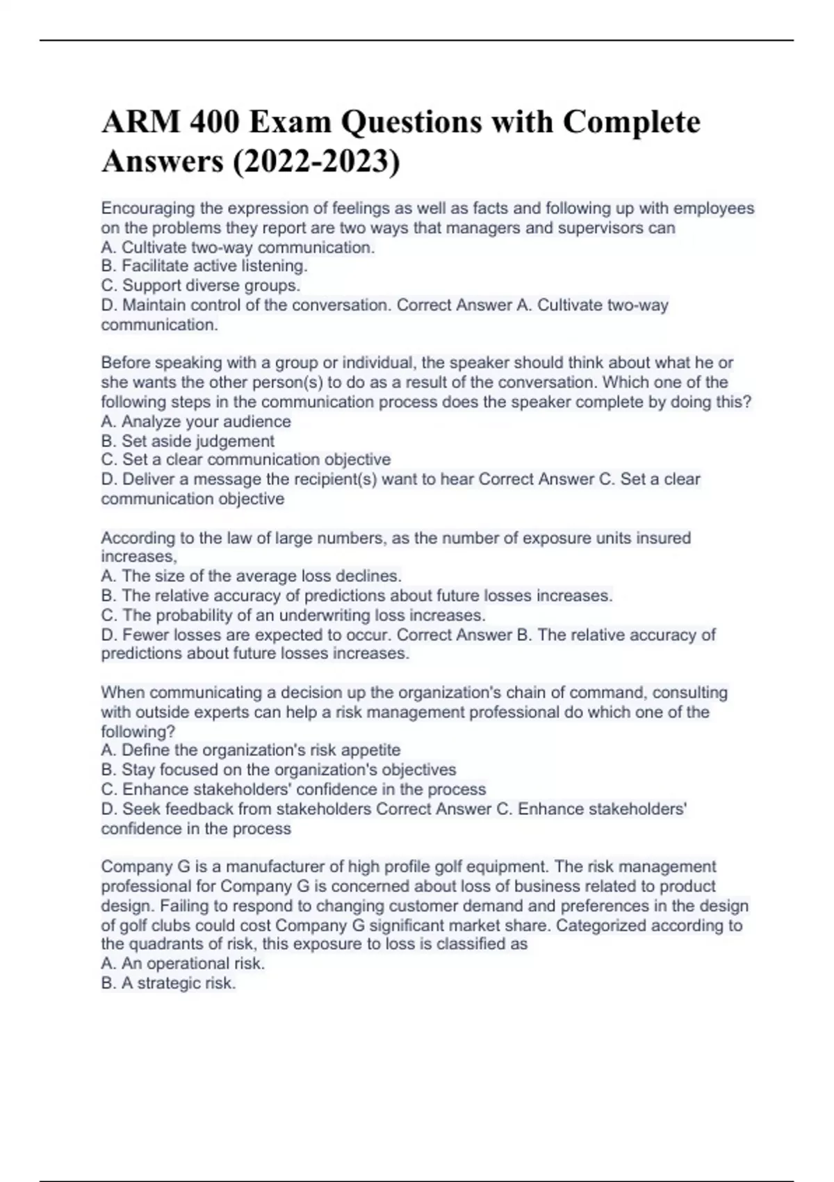 Encouraging the expression of feelings as well as facts and following up with employees on the problems they report are two ways that managers and supervisors can A. Cultivate two-way communication. B. Facilitate active listening. C. Support diverse groups. D. Maintain control of the conversation. Correct Answer A. Cultivate two-way communication. Before speaking with a group or individual, the speaker should think about what he or she wants the other person(s) to do as a result of the conversation. Which one of the following steps in the communication process does the speaker complete by doing this? A. Analyze your audience B. Set aside judgement C. Set a clear communication objective D. Deliver a message the recipient(s) want to hear Correct Answer C. Set a clear communication objective According to the law of large numbers, as the number of exposure units insured increases, A. The size of the average loss declines. B. The relative accuracy of predictions about future losses increases. C. The probability of an underwriting loss increases. D. Fewer losses are expected to occur. Correct Answer B. The relative accuracy of predictions about future losses increases. When communicating a decision up the organization's chain of command, consulting with outside experts can help a risk management professional do which one of the following? A. Define the organization's risk appetite B. Stay focused on the organization's objectives C. Enhance stakeholders' confidence in the process D. Seek feedback from stakeholders Correct Answer C. Enhance stakeholders' confidence in the process Company G is a manufacturer of high profile golf equipment. The risk management professional for Company G is concerned about loss of business related to product design. Failing to respond to changing customer demand and preferences in the design of golf clubs could cost Company G significant market share. Categorized according to the quadrants of risk, this exposure to loss is classified as A. An operational risk. B. A strategic risk.