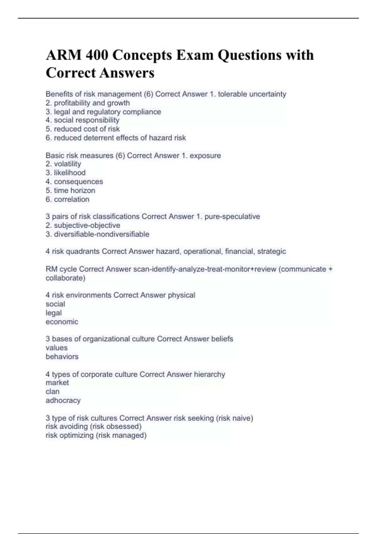 Benefits of risk management (6) Correct Answer 1. tolerable uncertainty 2. profitability and growth 3. legal and regulatory compliance 4. social responsibility 5. reduced cost of risk 6. reduced deterrent effects of hazard risk Basic risk measures (6) Correct Answer 1. exposure 2. volatility 3. likelihood 4. consequences 5. time horizon 6. correlation 3 pairs of risk classifications Correct Answer 1. pure-speculative 2. subjective-objective 3. diversifiable-nondiversifiable 4 risk quadrants Correct Answer hazard, operational, financial, strategic RM cycle Correct Answer scan-identify-analyze-treat-monitor+review (communicate + collaborate) 4 risk environments Correct Answer physical social legal economic 3 bases of organizational culture Correct Answer beliefs values behaviors 4 types of corporate culture Correct Answer hierarchy market clan adhocracy