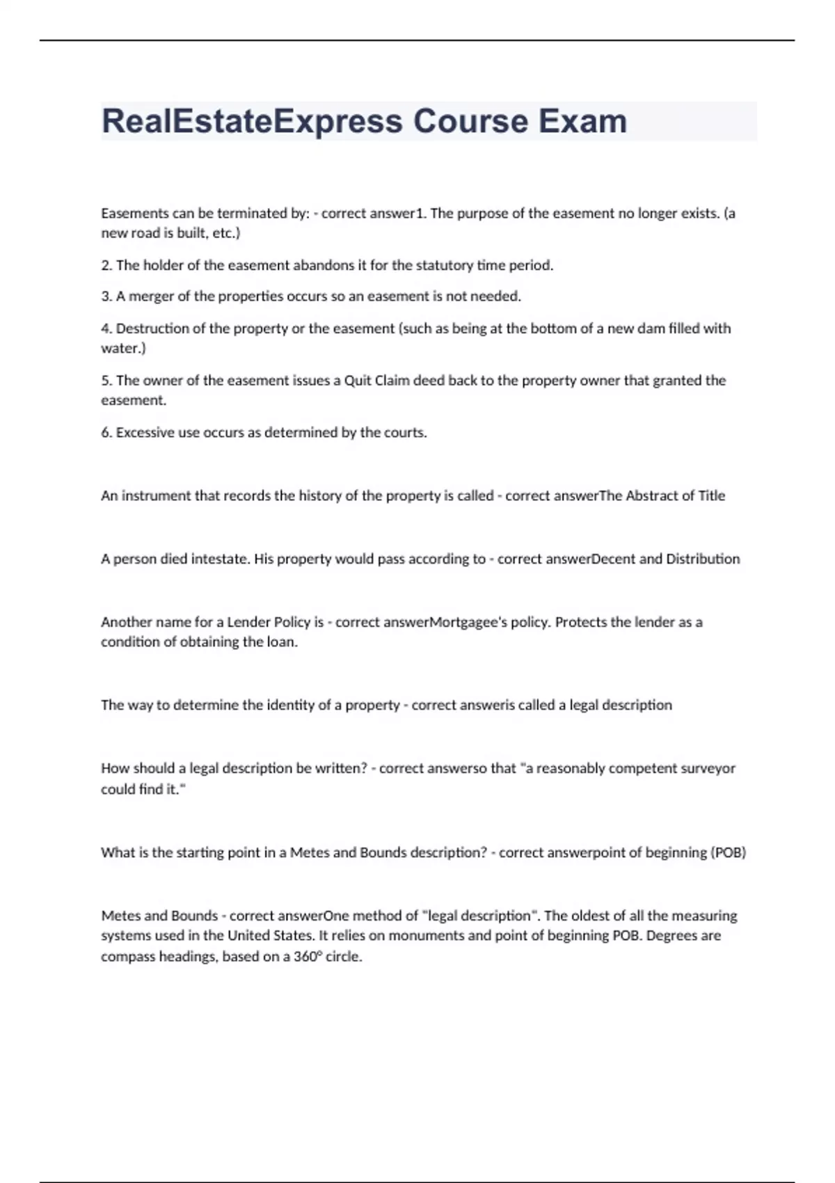 Easements can be terminated by: - correct answer1. The purpose of the easement no longer exists. (a new road is built, etc.) 2. The holder of the easement abandons it for the statutory time period. 3. A merger of the properties occurs so an easement is not needed. 4. Destruction of the property or the easement (such as being at the bottom of a new dam filled with water.) 5. The owner of the easement issues a Quit Claim deed back to the property owner that granted the easement. 6. Excessive use occurs as determined by the courts. An instrument that records the history of the property is called - correct answerThe Abstract of Title A person died intestate. His property would pass according to - correct answerDecent and Distribution Another name for a Lender Policy is - correct answerMortgagee's policy. Protects the lender as a condition of obtaining the loan. The way to determine the identity of a property - correct answeris called a legal description How should a legal description be written? - correct answerso that "a reasonably competent surveyor could find it." What is the starting point in a Metes and Bounds description? - correct answerpoint of beginning (POB) Metes and Bounds - correct answerOne method of "legal description". The oldest of all the measuring systems used in the United States. It relies on monuments and point of beginning POB. Degrees are compass headings, based on a 360° circle. 3 forms of legal descripti