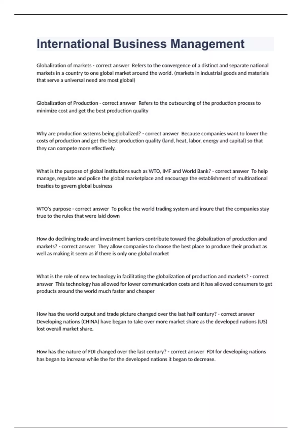 Globalization of markets - correct answer Refers to the convergence of a distinct and separate national markets in a country to one global market around the world. (markets in industrial goods and materials that serve a universal need are most global) Globalization of Production - correct answer Refers to the outsourcing of the production process to minimize cost and get the best production quality Why are production systems being globalized? - correct answer Because companies want to lower the costs of production and get the best production quality (land, heat, labor, energy and capital) so that they can compete more effectively. What is the purpose of global institutions such as WTO, IMF and World Bank? - correct answer To help manage, regulate and police the global marketplace and encourage the establishment of multinational treaties to govern global business WTO's purpose - correct answer To police the world trading system and insure that the companies stay true to the rules that were laid down How do declining trade and investment barriers contribute toward the globalization of production and markets? - correct answer They allow companies to choose the best place to produce their product as well as making it seem as if there is only one global market What is the role of new technology in facilitating the globalization of production and markets? - correct answer This technology has allowed for lower communication costs and it has allowed consumers to get products around the world much faster and cheaper How has the world output and trade picture changed over the last half century? - correct answer Developing nations (CHINA) have began to take over more market share as the developed nations (US) lost overall market share. How has the nature of FDI changed over the last century? - correct answer FDI for developing nations has began to increase while the for the developed nations it began to decrease. Collectivism - correct answer A political system that stresses a group or collective goal rather than an individual goal Socialism - correct answer A political system in which the state/government owns all the companies and their production, distribution and exchange. Individualism - correct answer A political system that stresses individual goals rather than a collective goal Market Economy - correct answer The goods and services as well as price of product produced by a company are based off of supply and demand Command Economy - correct answer The determination of what goods and services are sold by the government Common Law - correct answer A system of law based on tradition, precedent, and customs. Civil Law - correct answer A system of law based on a very detailed set of rules and codes. Theocratic Law - correct answer A system of law based of religious teachings What is the impact of high levels of corruption on economic growth in a nation? - correct answer By taking away profits, politicians and leaders reduce the returns to business investment which in return reduces incentive for businesses to invest in that country which in turn leads to lower economic growth. Foreign corrupt practices act - correct answer This act insures that US companies to not offer or accept bribes to get into other countries Most supportive international business systems - correct answer Democracies, market-based economy, stong-legal system that protects property rights and limits corruption Purchasing Power Parity - correct answer An adjustment to gross domestic product per capita to reflect the differences in cost of living Human Development Index - correct answer An index based on projected life expectancy, amount/quality of education, and whether incomes are sufficient to meet basic needs in the country What do economists believe to be the key determinants of economic progress? - correct answer Innovation and entrepreneurial activity Strategy - correct answer A way that managers decide to achieve the company goals Value Creation - correct answer The amount of value a firm creates= costs of production - the value that consumers perceive in it's products Primary Activities - correct answer Production, Marketing & Sales, R&D, and Customer Service Support Activities - correct answer Logistics, HR, Information systems