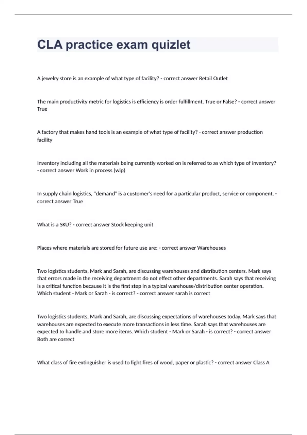 A jewelry store is an example of what type of facility? - correct answer Retail Outlet The main productivity metric for logistics is efficiency is order fulfillment. True or False? - correct answer True A factory that makes hand tools is an example of what type of facility? - correct answer production facility Inventory including all the materials being currently worked on is referred to as which type of inventory? - correct answer Work in process (wip) In supply chain logistics, "demand" is a customer's need for a particular product, service or component. - correct answer True What is a SKU? - correct answer Stock keeping unit Places where materials are stored for future use are: - correct answer Warehouses Two logistics students, Mark and Sarah, are discussing warehouses and distribution centers. Mark says that errors made in the receiving department do not effect other departments. Sarah says that receiving is a critical function because it is the first step in a typical warehouse/distribution center operation. Which student - Mark or Sarah - is correct? - correct answer sarah is correct Two logistics students, Mark and Sarah, are discussing expectations of warehouses today. Mark says that warehouses are expected to execute more transactions in less time. Sarah says that warehouses are expected to handle and store more items. Which student - Mark or Sarah - is correct? - correct answer Both are correct What class of fire extinguisher is used to fight fires of wood, paper or plastic? - correct answer Class A