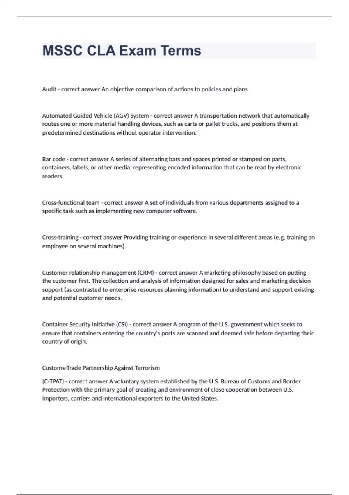 Audit - correct answer An objective comparison of actions to policies and plans. Automated Guided Vehicle (AGV) System - correct answer A transportation network that automatically routes one or more material handling devices, such as carts or pallet trucks, and positions them at predetermined destinations without operator intervention. Bar code - correct answer A series of alternating bars and spaces printed or stamped on parts, containers, labels, or other media, representing encoded information that can be read by electronic readers. Cross-functional team - correct answer A set of individuals from various departments assigned to a specific task such as implementing new computer software. Cross-training - correct answer Providing training or experience in several different areas (e.g. training an employee on several machines). Customer relationship management (CRM) - correct answer A marketing philosophy based on putting the customer first. The collection and analysis of information designed for sales and marketing decision support (as contrasted to enterprise resources planning information) to understand and support existing and potential customer needs. Container Security Initiative (CSI) - correct answer A program of the U.S. government which seeks to ensure that containers entering the country's ports are scanned and deemed safe before departing their country of origin. Customs-Trade Partnership Against Terrorism (C-TPAT) - correct answer A voluntary system established by the U.S. Bureau of Customs and Border Protection with the primary goal of creating and environment of close cooperation between U.S. importers, carriers and international exporters to the United States.
