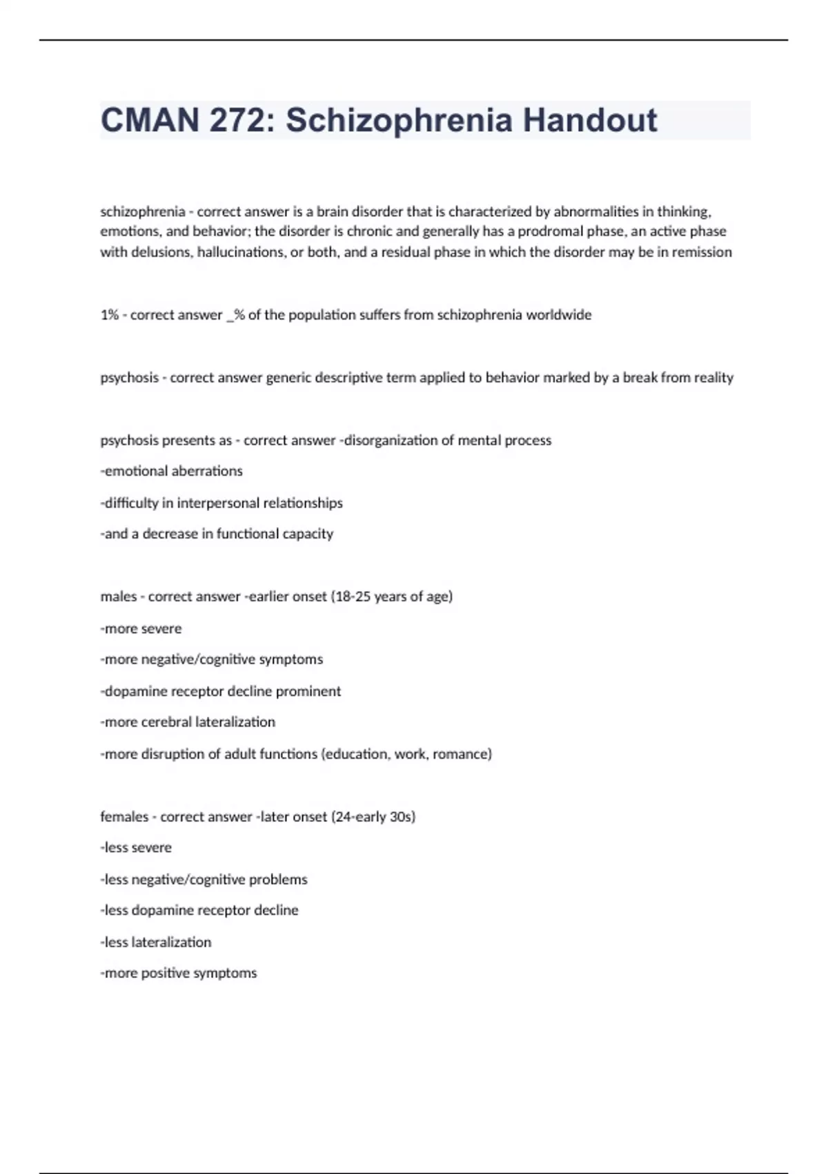 CMAN 272 Schizophrenia Handout fully solved graded A+ 2023