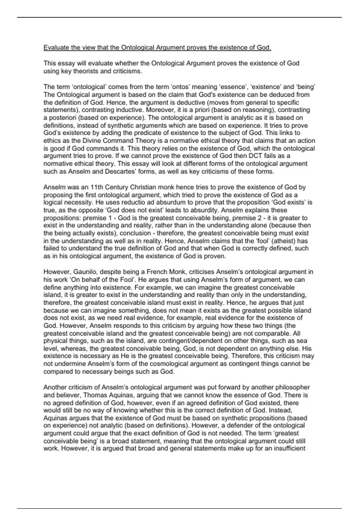 This essay will evaluate whether the Ontological Argument proves the existence of God