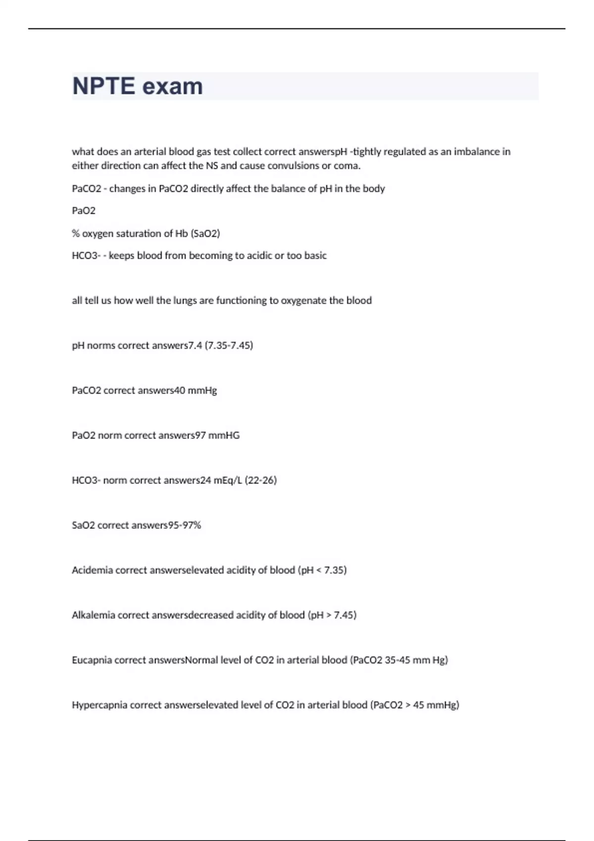 what does an arterial blood gas test collect correct answerspH -tightly regulated as an imbalance in either direction can affect the NS and cause convulsions or coma. PaCO2 - changes in PaCO2 directly affect the balance of pH in the body PaO2 % oxygen saturation of Hb (SaO2) HCO3- - keeps blood from becoming to acidic or too basic all tell us how well the lungs are functioning to oxygenate the blood pH norms correct answers7.4 (7.35-7.45) PaCO2 correct answers40 mmHg PaO2 norm correct answers97 mmHG HCO3- norm correct answers24 mEq/L (22-26) SaO2 correct answers95-97% Acidemia correct answerselevated acidity of blood (pH 7.35) Alkalemia correct answersdecreased acidity of blood (pH 7.45) Eucapnia correct answersNormal level of CO2 in arterial blood (PaCO2 35-45 mm Hg) Hypercapnia correct answerselevated level of CO2 in arterial blood (PaCO2 45 mmHg)
