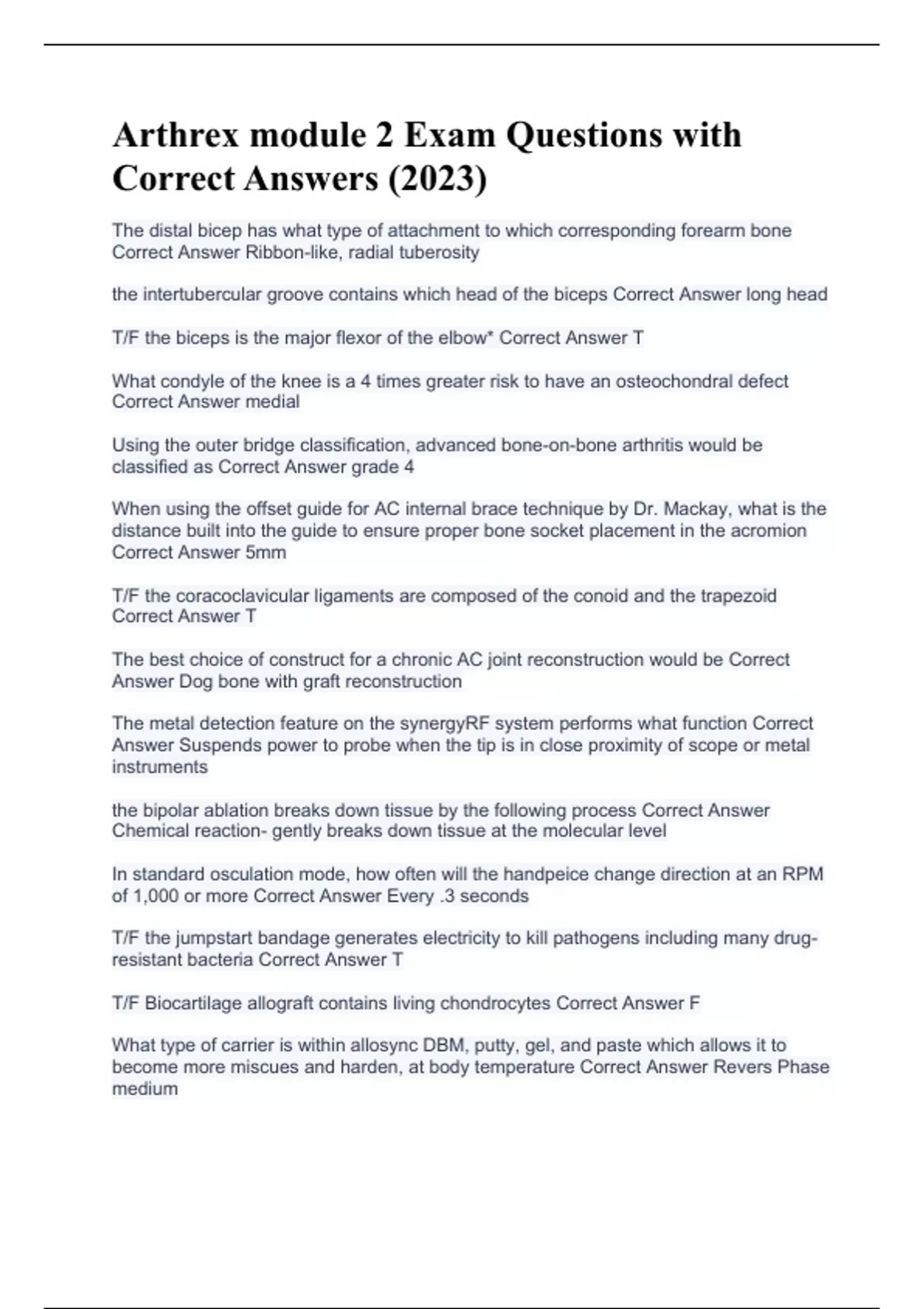 The distal bicep has what type of attachment to which corresponding forearm bone Correct Answer Ribbon-like, radial tuberosity the intertubercular groove contains which head of the biceps Correct Answer long head T/F the biceps is the major flexor of the elbow* Correct Answer T What condyle of the knee is a 4 times greater risk to have an osteochondral defect Correct Answer medial Using the outer bridge classification, advanced bone-on-bone arthritis would be classified as Correct Answer grade 4 When using the offset guide for AC internal brace technique by Dr. Mackay, what is the distance built into the guide to ensure proper bone socket placement in the acromion Correct Answer 5mm T/F the coracoclavicular ligaments are composed of the conoid and the trapezoid Correct Answer T The best choice of construct for a chronic AC joint reconstruction would be Correct Answer Dog bone with graft reconstruction The metal detection feature on the synergyRF system performs what function Correct Answer Suspends power to probe when the tip is in close proximity of scope or metal instruments the bipolar ablation breaks down tissue by the following process Correct Answer Chemical reaction- gently breaks down tissue at the molecular level In standard osculation mode, how often will the handpeice change direction at an RPM of 1,000 or more Correct