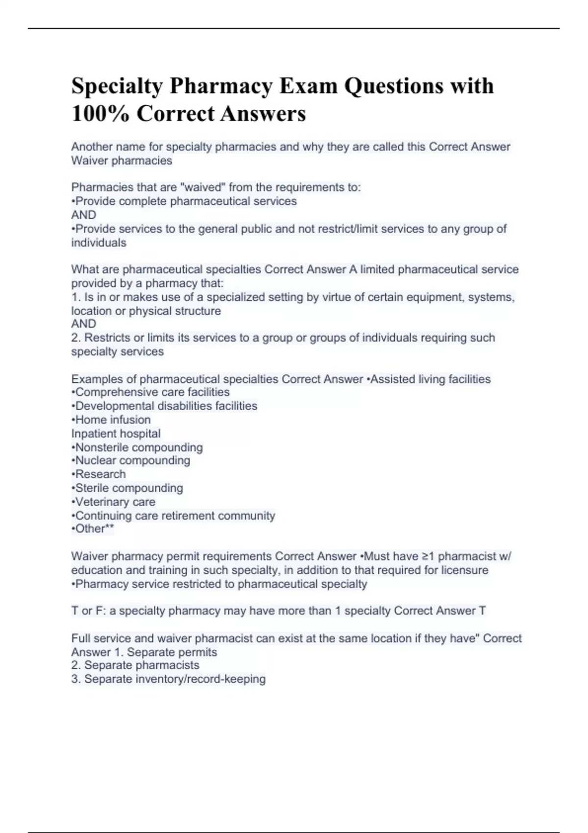 Another name for specialty pharmacies and why they are called this Correct Answer Waiver pharmacies Pharmacies that are "waived" from the requirements to: •Provide complete pharmaceutical services AND •Provide services to the general public and not restrict/limit services to any group of individuals What are pharmaceutical specialties Correct Answer A limited pharmaceutical service provided by a pharmacy that: 1. Is in or makes use of a specialized setting by virtue of certain equipment, systems, location or physical structure AND 2. Restricts or limits its services to a group or groups of individuals requiring such specialty services Examples of pharmaceutical specialties Correct Answer •Assisted living facilities •Comprehensive care facilities •Developmental disabilities facilities •Home infusion Inpatient hospital •Nonsterile compounding •Nuclear compounding •Research •Sterile compounding •Veterinary care •Continuing care retirement community •Other** Waiver pharmacy permit requirements Correct Answer •Must have ≥1 pharmacist w/ education and training in such specialty, in addition to that required for licensure •Pharmacy service restricted to pharmaceutical specialty T or F: a specialty pharmacy may have more than 1 specialty Correct Answer T Full service and waiver pharmacist can exist at the same location if they have" Correct Answer 1. Separate permits 2. Separate pharmacists 3. Separate inventory/record-keeping