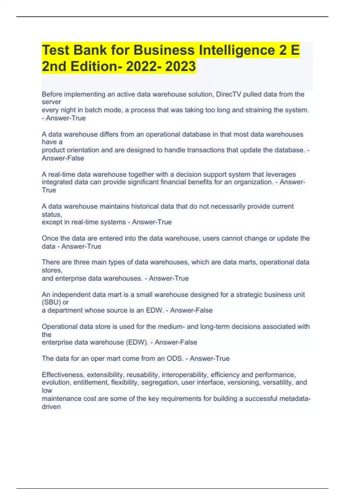 Before implementing an active data warehouse solution, DirecTV pulled data from the server every night in batch mode, a process that was taking too long and straining the system. - Answer-True A data warehouse differs from an operational database in that most data warehouses have a product orientation and are designed to handle transactions that update the database. - Answer-False A real-time data warehouse together with a decision support system that leverages integrated data can provide significant financial benefits for an organization. - Answer-True A data warehouse maintains historical data that do not necessarily provide current status, except in real-time systems - Answer-True Once the data are entered into the data warehouse, users cannot change or update the data - Answer-True There are three main types of data warehouses, which are data marts, operational data stores, and enterprise data warehouses. - Answer-True An independent data mart is a small warehouse designed for a strategic business unit (SBU) or a department whose source is an EDW. - Answer-False Operational data store is used for the medium- and long-term decisions associated with the enterprise data warehouse (EDW). - Answer-False The data for an oper mart come from an ODS. - Answer-True Effectiveness, extensibility, reusability, interoperability, efficiency and performance, evolution, entitlement, flexibility, segregation, user interface, versioning, versatility, and low maintenance cost are some of the key requirements for building a successful metadata-driven