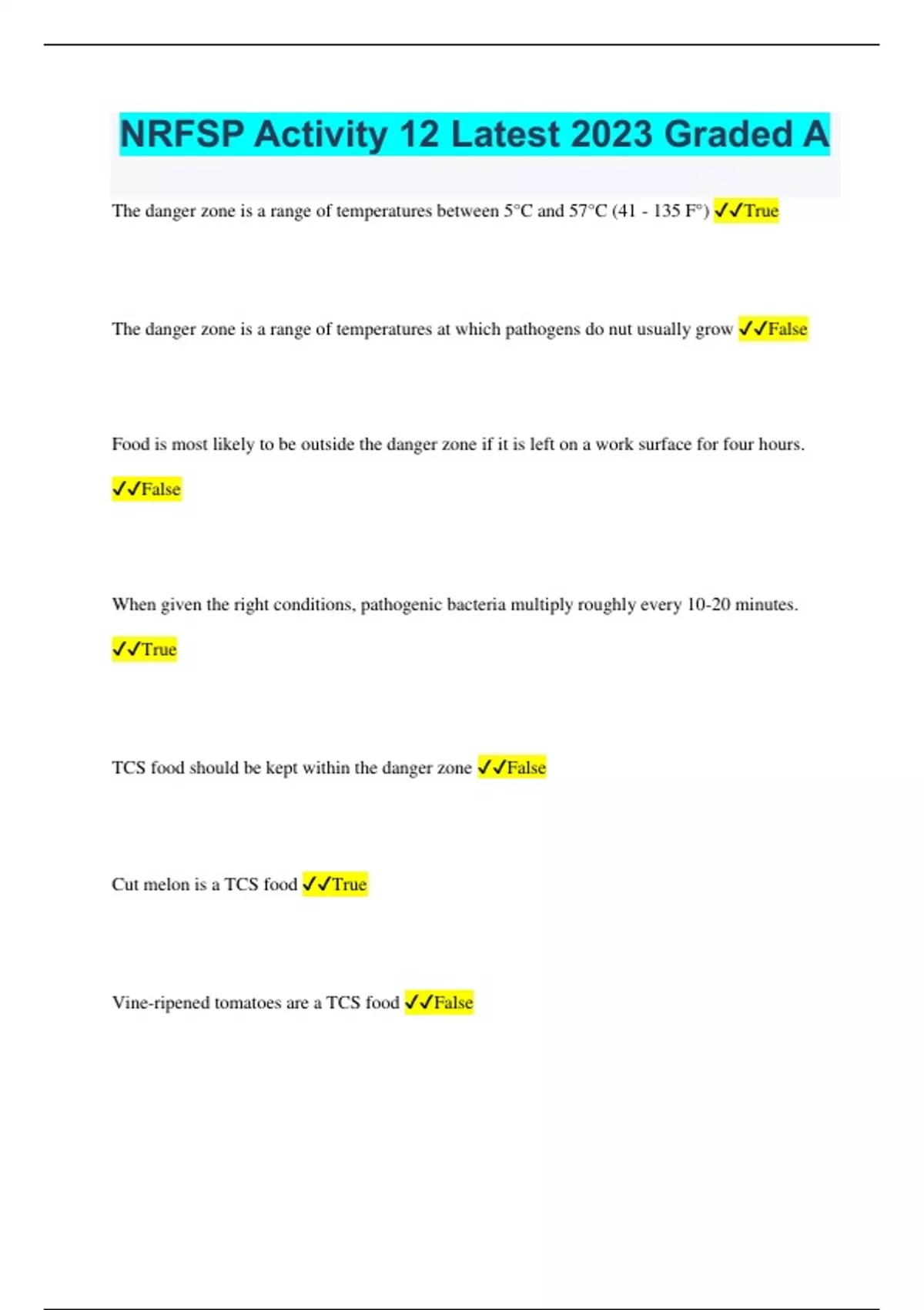 NRFSP Activity 12 Latest 2023 Graded A The danger zone is a range of temperatures between 5°C and 57°C (41 - 135 F°) True The danger zone is a range of temperatures at which pathogens do nut usually grow False Food is most likely to be outside the danger zone if it is left on a work surface for four hours. False When given the right conditions, pathogenic bacteria multiply roughly every 10-20 minutes. True TCS food should be kept within the danger zone False Cut melon is a TCS food True