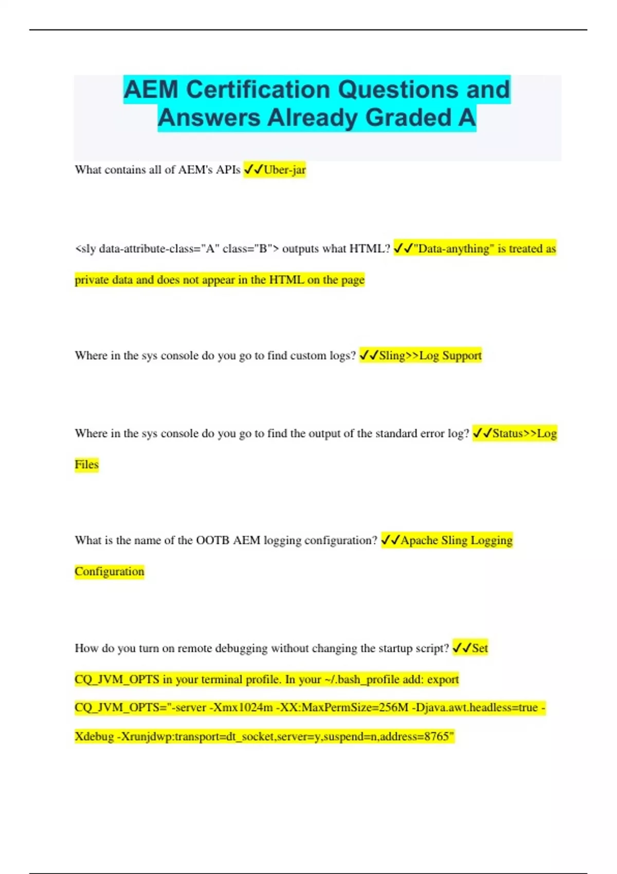 AEM Certification Questions and Answers Already Graded A What contains all of AEM's APIs Uber-jar sly data-attribute-class="A" class="B" outputs what HTML? "Data-anything" is treated as private data and does not appear in the HTML on the page Where in the sys console do you go to find custom logs? SlingLog Support Where in the sys console do you go to find the output of the standard error log? StatusLog Files What is the name of the OOTB AEM logging configuration? Apache Sling Logging Configuration How do you turn on remote debugging without changing the startup script? Set CQ_JVM_OPTS in your terminal profile. In your ~/.bash_profile add: export CQ_JVM_OPTS="-server -Xmx1024m -XX:MaxPermSize=256M -Dess=true - Xdebug -Xrunjdwp:transport=dt_socket,server=y,suspend=n,address=8765" You want to install an author instance on port 6302. What should you name the jar? Cqauthor-p6302 A server is running slowly. How should a developer monitor server usage? Go to operationsmonitoring and create a new measurement of Sessions Give two ways you can create an authenticated Session. Create a custom Java class that implements Interface AuthenticationHander? How do you watch a node for a change? Can use a Workf