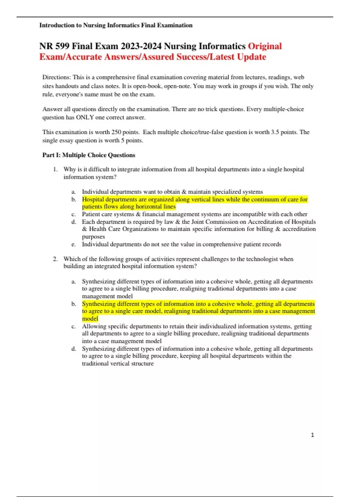 NR 599 Final Exam Nursing Informatics Original Exam/Accurate Answers/Assured Success/Latest Update