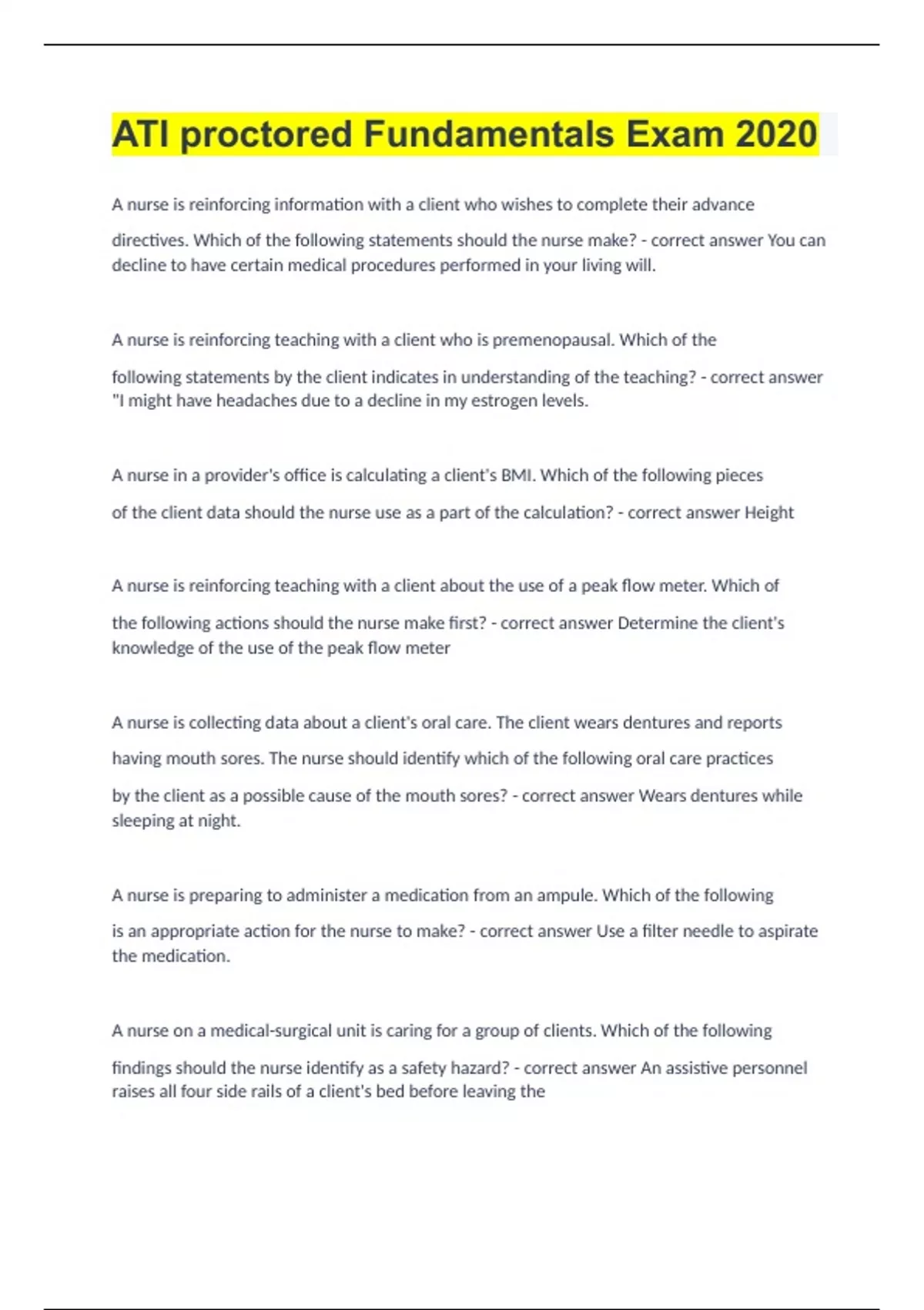 ATI proctored Fundamentals Exam 2020 solved,updated&verified 2023/24