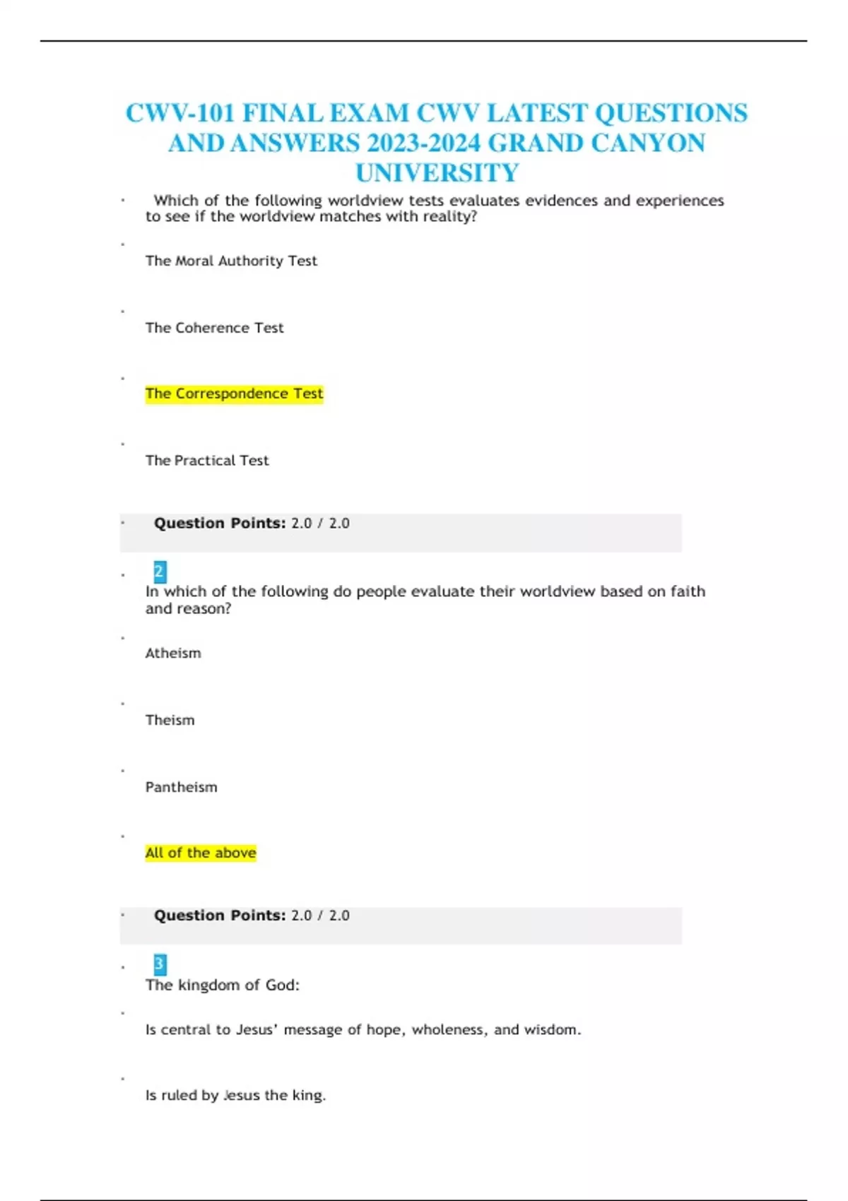 CWV-101 FINAL EXAM CWV LATEST QUESTIONS AND ANSWERS GRAND CANYON
