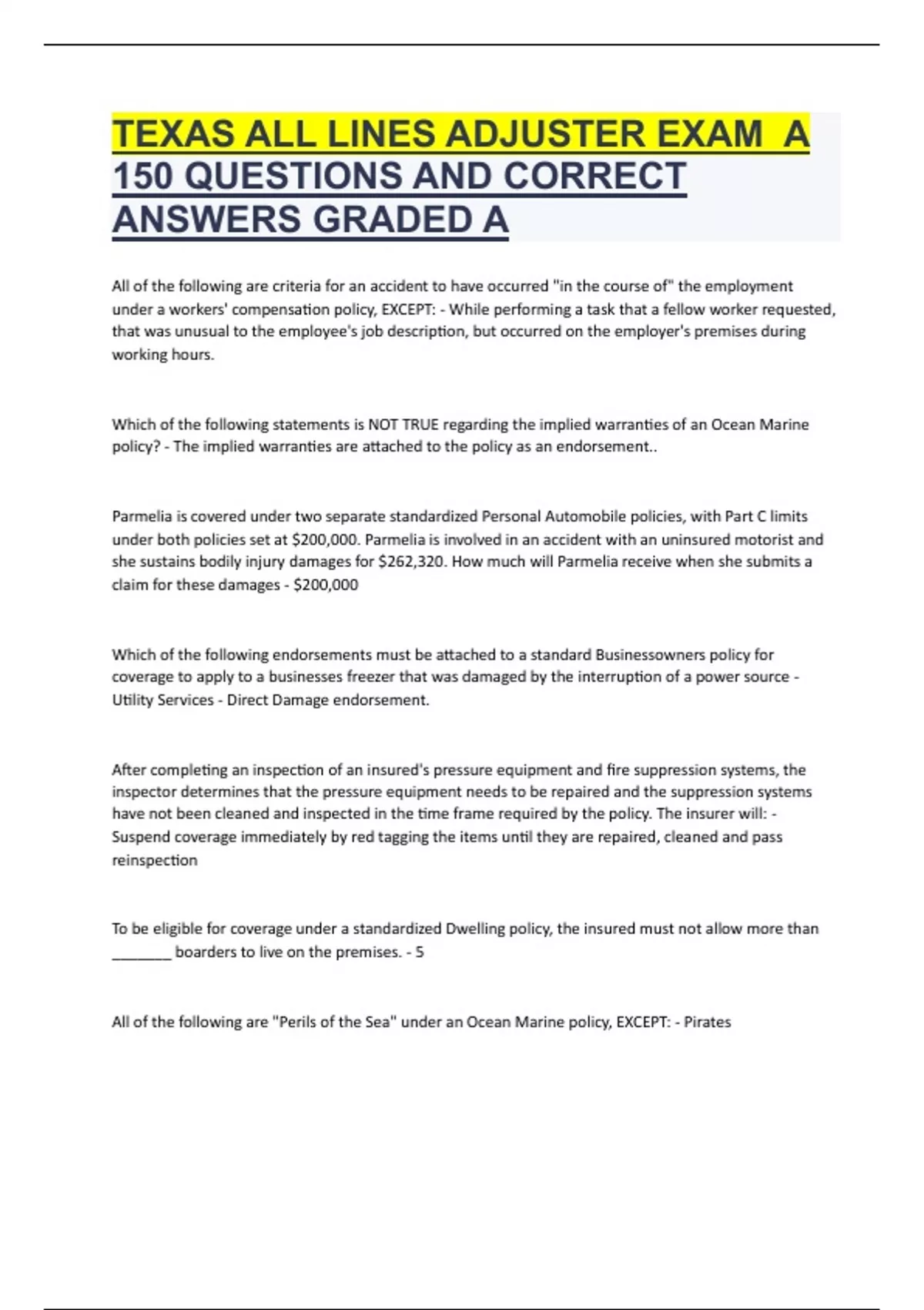 TEXAS ALL LINES ADJUSTER EXAM A 150 QUESTIONS AND CORRECT ANSWERS GRADED A