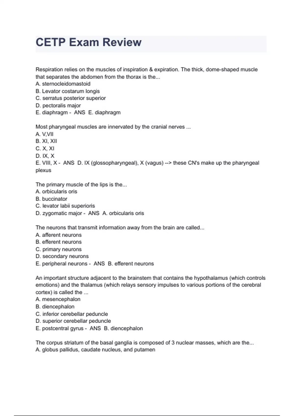 CETP Exam Review Questions With Verified Solutions Respiration relies on the muscles of inspiration & expiration. The thick, dome-shaped muscle that separates the abdomen from the thorax is the... A. sternocleidomastoid B. Levator costarum longis C. serratus posterior superior D. pectoralis major E. diaphragm - ANS E. diaphragm Most pharyngeal muscles are innervated by the cranial nerves ... A. V,VII B. XI, XII C. X, XI D. IX, X E. VIII, X - ANS D. IX (glossopharyngeal), X (vagus) -- these CN's make up the pharyngeal plexus The primary muscle of the lips is the... A. orbicularis oris B. buccinator C. levator labii superioris D. zygomatic major - ANS A. orbicularis oris The neurons that transmit information away from the brain are called... A. afferent neurons B. efferent neurons C. primary neurons D. secondary neurons E. peripheral neurons - ANS B. efferent neurons An important structure adjacent to the brainstem that contains the hypothalamus (which controls emotions) and the thalamus (which relays sensory impulses to various portions of the cerebral cortex) is called the ... A. mesencephalon B. diencephalon C. inferior cerebellar peduncle D. superior cerebellar peduncle E. postcentral gyrus - ANS B. diencephalon The corpus striatum of the basal ganglia is composed of 3 nuclear masses, which are the... A. globus pallidus, caudate nucleus, and putamen B. putamen, caudate nucleus, and basal ganglia C. supramarginal gyrus, angular gyrus, and putamen D. substantia nigra, angular gyrus, and globus pallidus - ANS A. globus pallidus, caudate nucleus, and putamen The structure that regulates body posture, equilibrium, and coordinated fine motor movements is the ... A. angular gyrus B. corticospinal tract C. circle of Willis D. cerebellum E. supramarginal gyrus - ANS D. cerebellum The anterior cerebral artery supplies blood to the... A. corpus callosum & basal ganglia B. corpus striatum C. caudate nucleus & globus pallidus D. substantia nigra E. lateral surface of the cortex - ANS A. corpus callosum & basal ganglia The middle cerebral artery supplies blood to the... - ANS Entire lateral surface of the cortex, including major regions of the frontal lobe. MCA is the biggest branch of the internal carotid artery. It supplies blood to major areas involved with motor & sensory functions + language, speech & hearing functions (i.e., motor cortex in the precentral gyrus, Broca's area, the primary auditory cortex, Wernicke's area, the supramarginal gyrus, the angular gyrus, somatosensory cortex). Damage may result in strokes, aphasia, reading & writing deficits, contralateral hemiplegia, impaired sense of pain, temp, touch & position. The laryngopharynx and the oropharynx add resonance to sounds produced by the larynx. The nasopharynx adds noticeable resonance to which sounds? A. k, g, t, d B. r, l, y C. f, sh, s D. m, n, ng E. w, y, r - ANS D. m, n, ng These are composed of a ring of connective tissue and muscle extending from the tips of the arytenoid cartilages to the larynx. They separate the laryngeal vestibule from the pharynx and help preserve the airway. A. Ventricular folds B. true vocal folds C. lamina propria