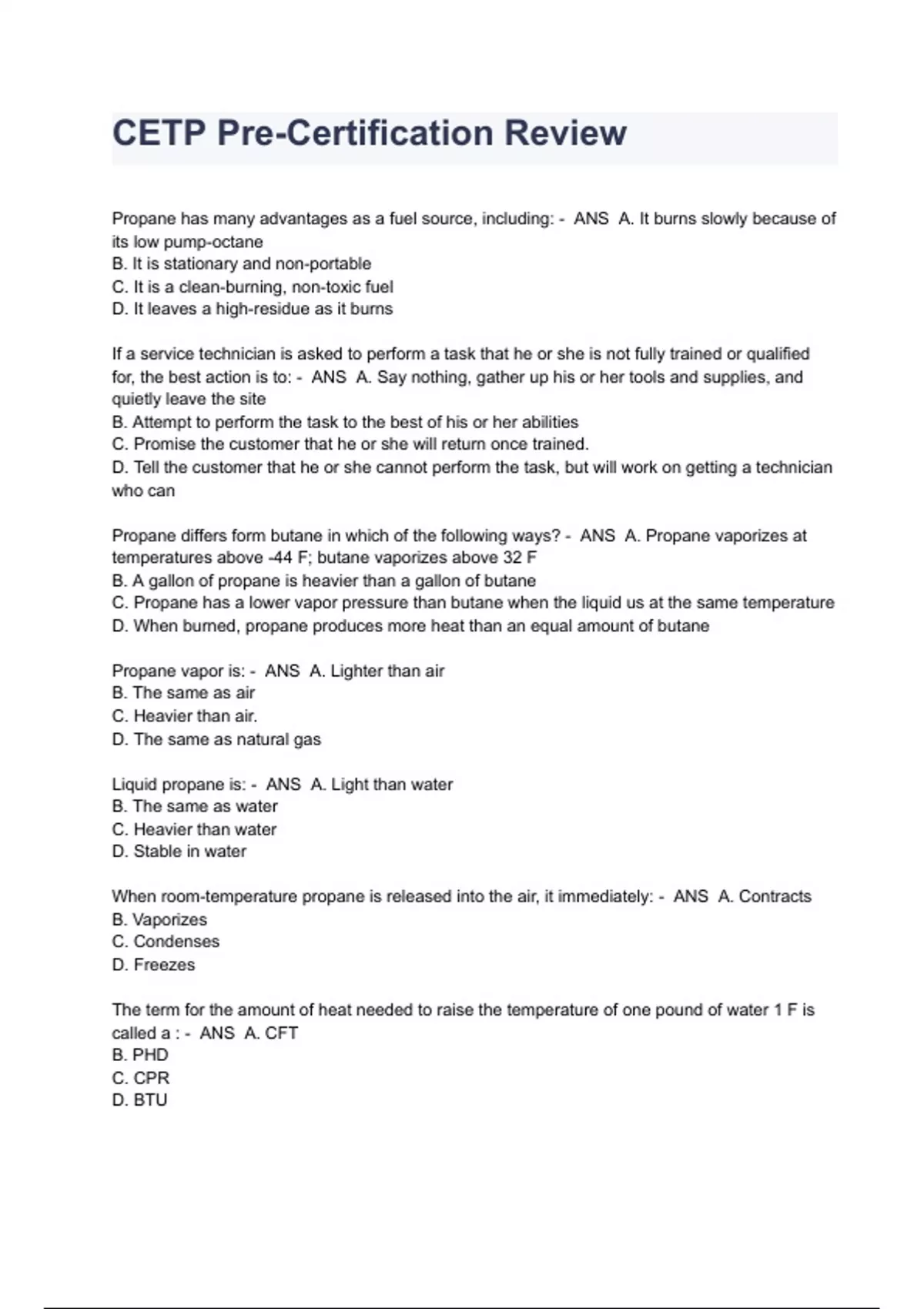 CETP Pre-Certification Review Questions And Answers Propane has many advantages as a fuel source, including: - ANS A. It burns slowly because of its low pump-octane B. It is stationary and non-portable C. It is a clean-burning, non-toxic fuel D. It leaves a high-residue as it burns If a service technician is asked to perform a task that he or she is not fully trained or qualified for, the best action is to: - ANS A. Say nothing, gather up his or her tools and supplies, and quietly leave the site B. Attempt to perform the task to the best of his or her abilities C. Promise the customer that he or she will return once trained. D. Tell the customer that he or she cannot perform the task, but will work on getting a technician who can Propane differs form butane in which of the following ways? - ANS A. Propane vaporizes at temperatures above -44 F; butane vaporizes above 32 F B. A gallon of propane is heavier than a gallon of butane C. Propane has a lower vapor pressure than butane when the liquid us at the same temperature D. When burned, propane produces more heat than an equal amount of butane Propane vapor is: - ANS A. Lighter than air B. The same as air C. Heavier than air. D. The same as natural gas Liquid propane is: - ANS A. Light than water B. The same as water C. Heavier than water D. Stable in water When room-temperature propane is released into the air, it immediately: - ANS A. Contracts B. Vaporizes C. Condenses D. Freezes The term for the amount of heat needed to raise the temperature of one pound of water 1 F is called a : - ANS A. CFT B. PHD C. CPR