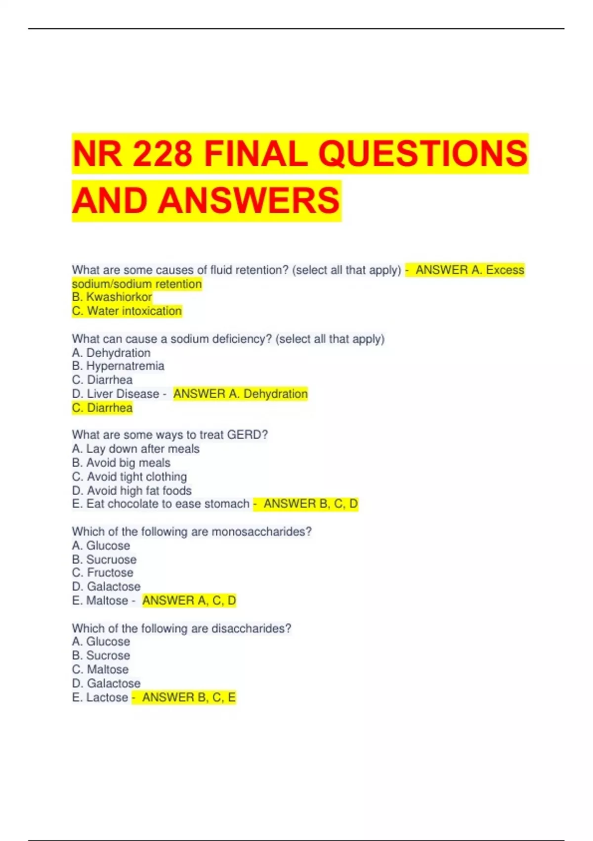 NR 228 FINAL QUESTIONS AND ANSWERS What are some causes of fluid retention? (select all that apply) - ANSWER A. Excess sodium/sodium retention B. Kwashiorkor C. Water intoxication What can cause a sodium deficiency? (select all that apply) A. Dehydration B. Hypernatremia C. Diarrhea D. Liver Disease - ANSWER A. Dehydration C. Diarrhea What are some ways to treat GERD? A. Lay down after meals B. Avoid big meals C. Avoid tight clothing D. Avoid high fat foods E. Eat chocolate to ease stomach - ANSWER B, C, D Which of the following are monosaccharides? A. Glucose B. Sucruose C. Fructose D. Galactose E. Maltose - ANSWER A, C, D Which of the following are disaccharides? A. Glucose B. Sucrose C. Maltose D. Galactose E. Lactose - ANSWER B, C, E Glucose is the main source of energy for ___? - ANSWER the brain and nerves What is the sweetest artificial sweetener? - ANSWER Sunette Which of the following are sources of complex carbohydrates? (select all that apply) A. Grapes B. Grains C. Legumes D. Apples E. Potatoes - ANSWER B,C,E What complications are related to gestational diabetes? (select all that apply) A. premature birth B. congenital abnormalities C. fetal death D. type 2 diabetes later in mother E. macrosomia - ANSWER A. premature birth B. congenital abnormalities C. fetal death D. type 2 diabetes later in mother E. macrosomia