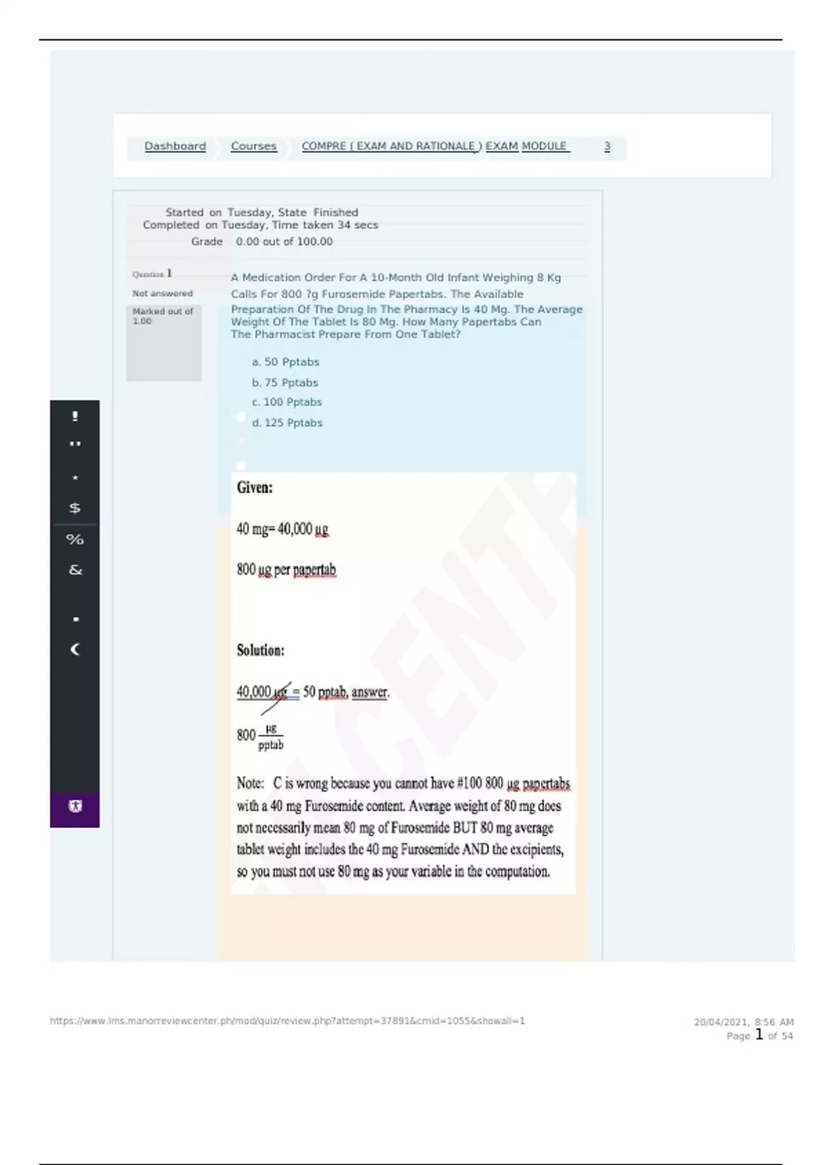 Dashboard Courses COMPRE ( EXAM AND RATIONALE ) EXAM MODULE 3 Started on Tuesday, State Finished Completed on Tuesday, Time taken 34 secs Grade 0.00 out of 100.00 Question 1 A Medication Order For A 10-Month Old Infant Weighing 8 Kg Not answered Calls For 800 ?g Furosemide Papertabs. The Available Marked out of Preparation Of The Drug In The Pharmacy Is 40 Mg. The Average 1.00 Weight Of The Tablet Is 80 Mg. How Many Papertabs Can The Pharmacist Prepare From One Tablet? a. 50 Pptabs b. 75 Pptabs c. 100 Pptabs d. 125 Pptabs ! " ⋆ $ % & ' ( The correct answer is: 50 Pptabs A Specific Drug Was Previously Categorized As A Drug That Has Shown An Adverse Effect On Fetus Of Pregnant Animals But Has No Well-Controlled Studies On Pregnant Women. A Recent Research, However, Showed An Evidence Of Risk On The Fetus Of Pregnant Women But Its Potential Benefits Outweigh Potential Risks In Certain Situations. What Is The New Pregnancy Category Of The Drug? a. Category B b. Category C c. Category D d. Category X ......................................................continued......................................................