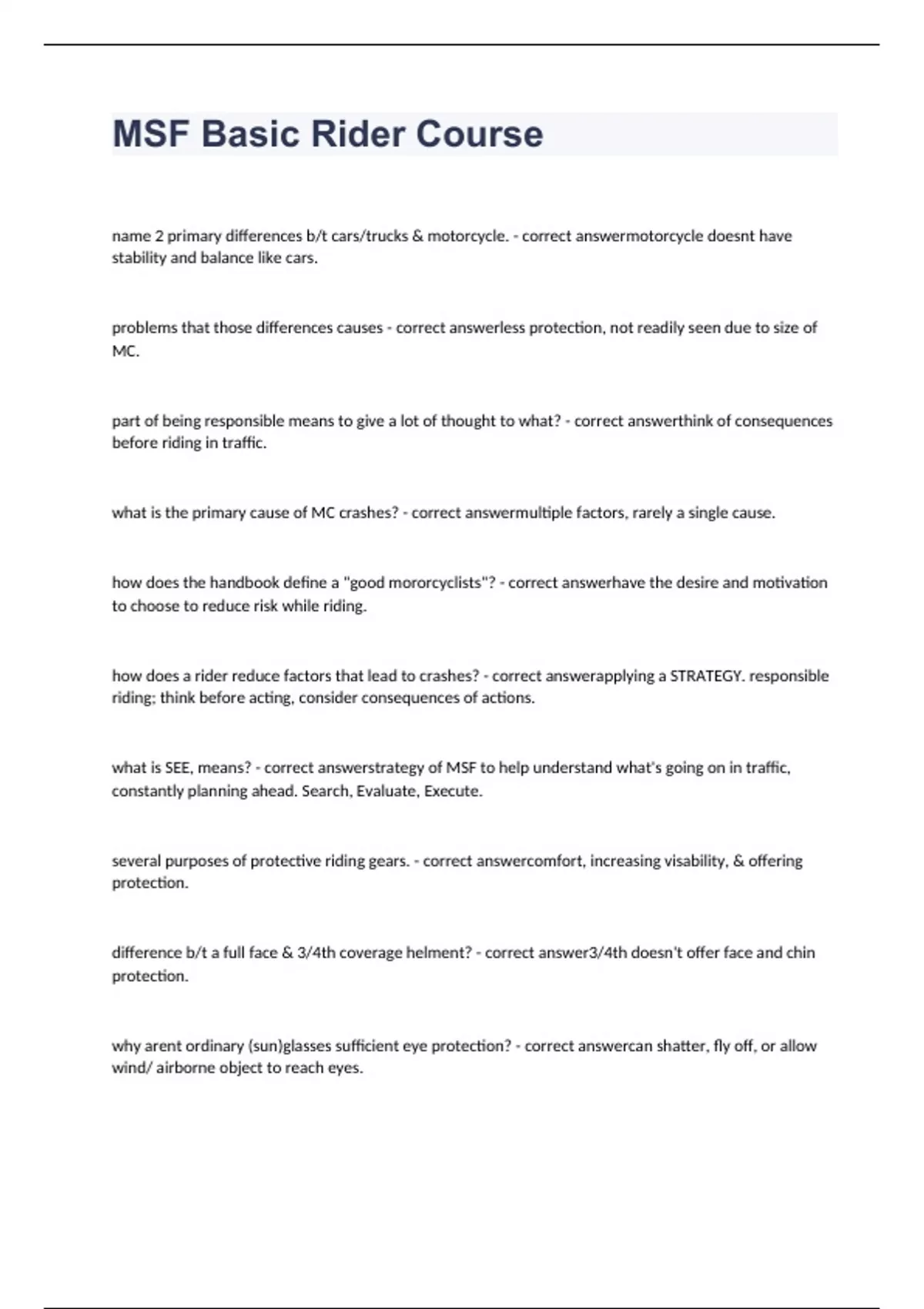 name 2 primary differences b/t cars/trucks & motorcycle. - correct answermotorcycle doesnt have stability and balance like cars. problems that those differences causes - correct answerless protection, not readily seen due to size of MC. part of being responsible means to give a lot of thought to what? - correct answerthink of consequences before riding in traffic. what is the primary cause of MC crashes? - correct answermultiple factors, rarely a single cause. how does the handbook define a "good mororcyclists"? - correct answerhave the desire and motivation to choose to reduce risk while riding. how does a rider reduce factors that lead to crashes? - correct answerapplying a STRATEGY. responsible riding; think before acting, consider consequences of actions. what is SEE, means? - correct answerstrategy of MSF to help understand what's going on in traffic, constantly planning ahead. Search, Evaluate, Execute. several purposes of protective riding gears. - correct answercomfort, increasing visability, & offering protection. difference b/t a full face & 3/4th coverage helment? - correct answer3/4th doesn't offer face and chin protection. why arent ordinary (sun)glasses sufficient eye protection? - correct answercan shatter, fly off, or allow wind/ airborne object to reach eyes.