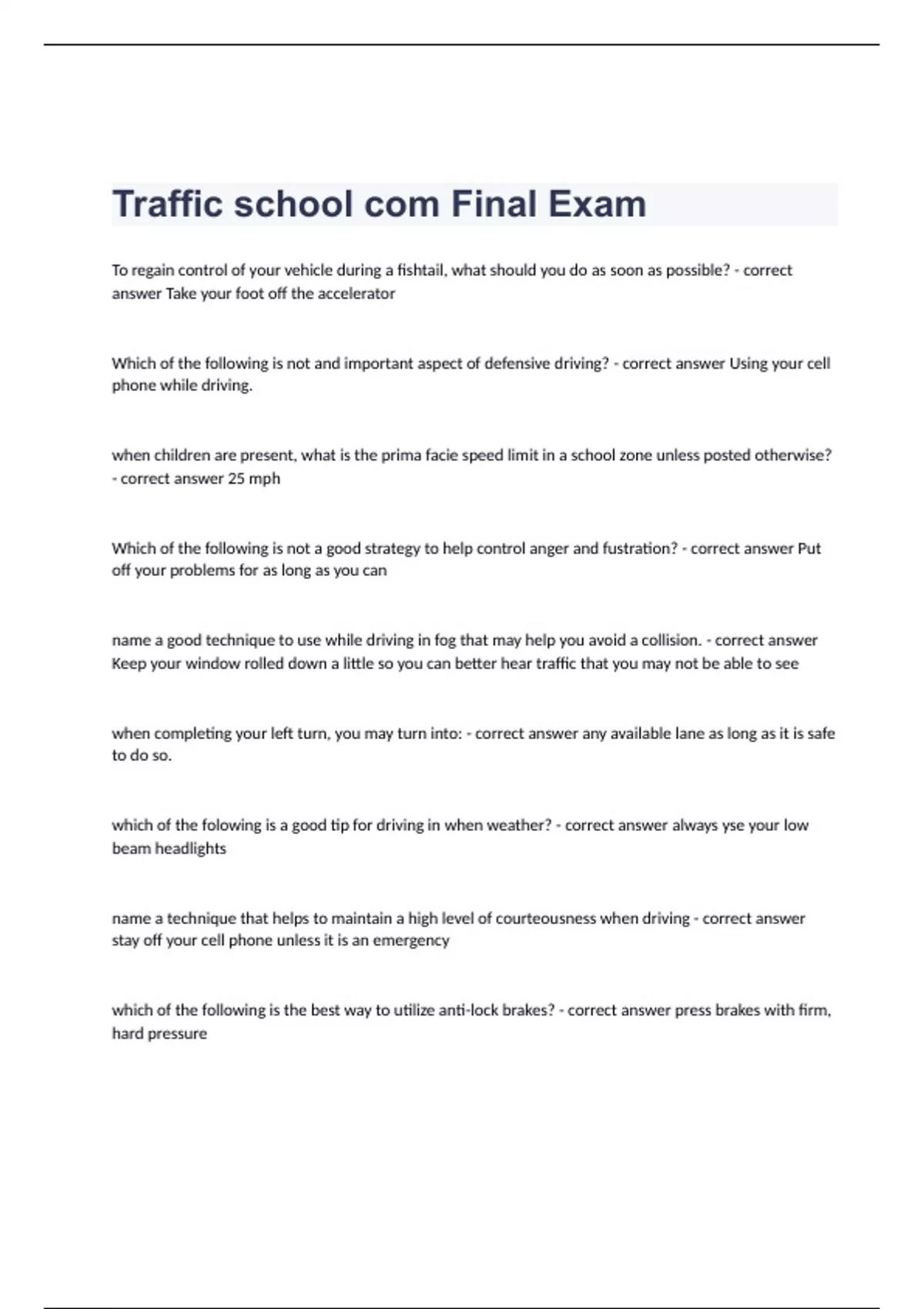 To regain control of your vehicle during a fishtail, what should you do as soon as possible? - correct answer Take your foot off the accelerator Which of the following is not and important aspect of defensive driving? - correct answer Using your cell phone while driving. when children are present, what is the prima facie speed limit in a school zone unless posted otherwise? - correct answer 25 mph Which of the following is not a good strategy to help control anger and fustration? - correct answer Put off your problems for as long as you can name a good technique to use while driving in fog that may help you avoid a collision. - correct answer Keep your window rolled down a little so you can better hear traffic that you may not be able to see when completing your left turn, you may turn into: - correct answer any available lane as long as it is safe to do so. which of the folowing is a good tip for driving in when weather? - correct answer always yse your low beam headlights name a technique that helps to maintain a high level of courteousness when driving - correct answer stay off your cell phone unless it is an emergency which of the following is the best way to utilize anti-lock brakes? - correct answer press brakes with firm, hard pressure