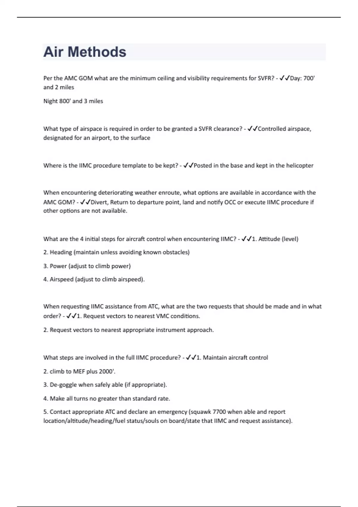 Per the AMC GOM what are the minimum ceiling and visibility requirements for SVFR? - Day: 700' and 2 miles Night 800' and 3 miles What type of airspace is required in order to be granted a SVFR clearance? - Controlled airspace, designated for an airport, to the surface Where is the IIMC procedure template to be kept? - Posted in the base and kept in the helicopter When encountering deteriorating weather enroute, what options are available in accordance with the AMC GOM? - Divert, Return to departure point, land and notify OCC or execute IIMC procedure if other options are not available. What are the 4 initial steps for aircraft control when encountering IIMC? - 1. Attitude (level) 2. Heading (maintain unless avoiding known obstacles) 3. Power (adjust to climb power) 4. Airspeed (adjust to climb airspeed). When requesting IIMC assistance from ATC, what are the two requests that should be made and in what order? - 1. Request vectors to nearest VMC conditions. 2. Request vectors to nearest appropriate instrument approach. What steps are involved in the full IIMC procedure? - 1. Maintain aircraft control 2. climb to MEF plus 2000'. 3. De-goggle when safely able (if appropriate). 4. Make all turns no greater than standard rate. 5. Contact appropriate ATC and declare an emergency (squawk 7700 when able and report location/altitude/heading/fuel status/souls on board/state that IIMC and request assistance).